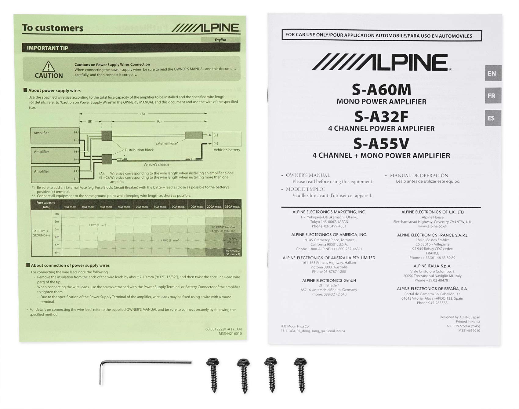 - (1) Alpine S-A60M 600 Watt RMS Mono Car Audio Amplifier Subwoofer Amp Class-D. (1) Alpine RUX-KNOB.2 Remote Control Bass Knob For Select Alpine Amplifiers Amps. Specifications:
