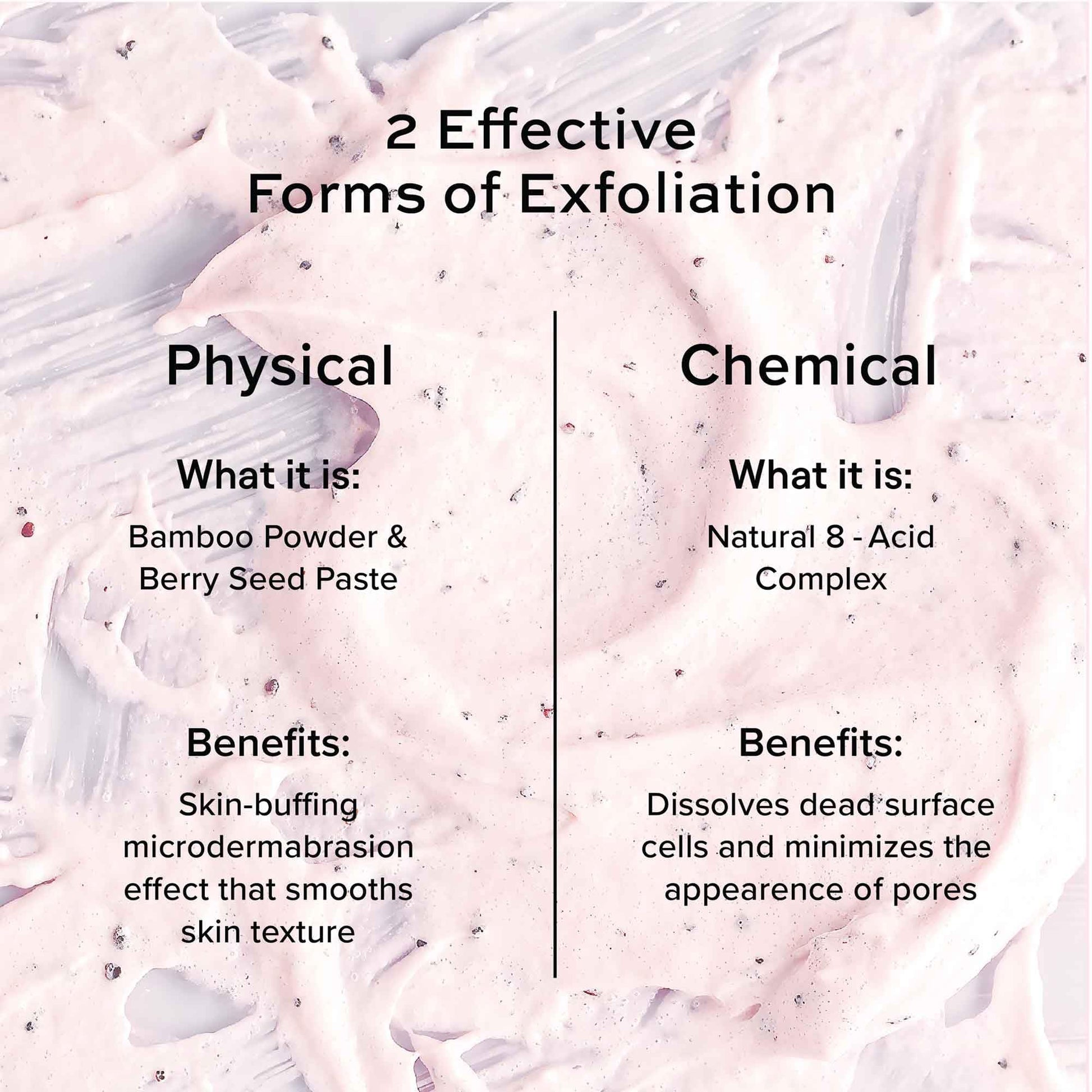 - A MASK, A PEEL, A POLISH: This 5-minute double exfoliate multitasker combines eight natural acids gentle enough to use daily. Gently dissolve complexion-dulling dead surface cells, while a pillowy bamboo powder and blueberry seed paste acts as a natural polish.
