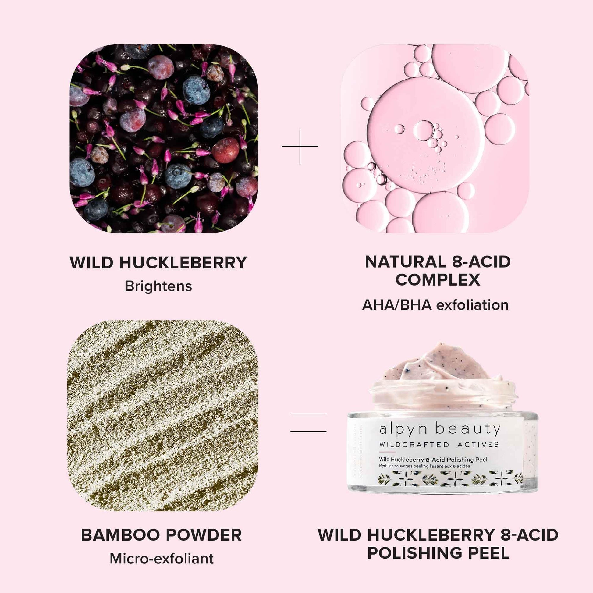 - KEY INGREDIENTS INCLUDE: Jackson Hole Wild Huckleberries to visibly brighten and protext against free-radical damage. Natural 8-Acid Complex (AHA/BHA Blend) to actively exfoliate. Bamboo Powder and Berry Seeds deliver a delicate, skin-buffing, microdermabrasion-like effect.