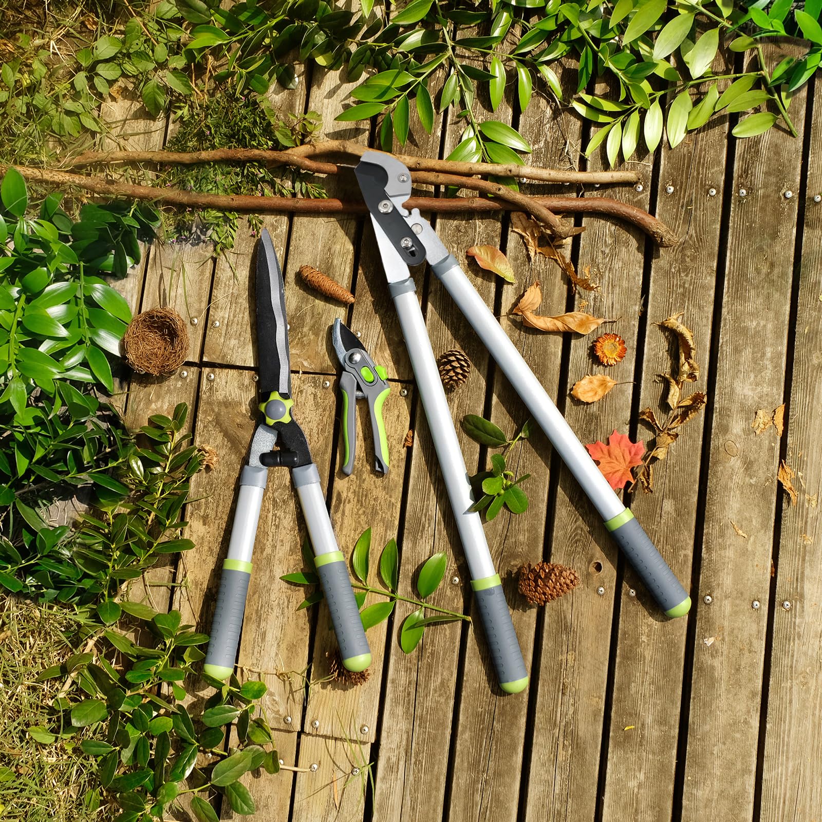 - PREMIUM BLADE & NON-SLIP HANDLE TO SAVE YOUR HALF LABOR: With razor-sharp blades, the garden shears lopper set doesn't take as much energy to have the branch cut, allowing garden more efficiently. Our hedge shears handles are ergonomic and comfortable to hold, even suitable for people with arthritis or the elderly.