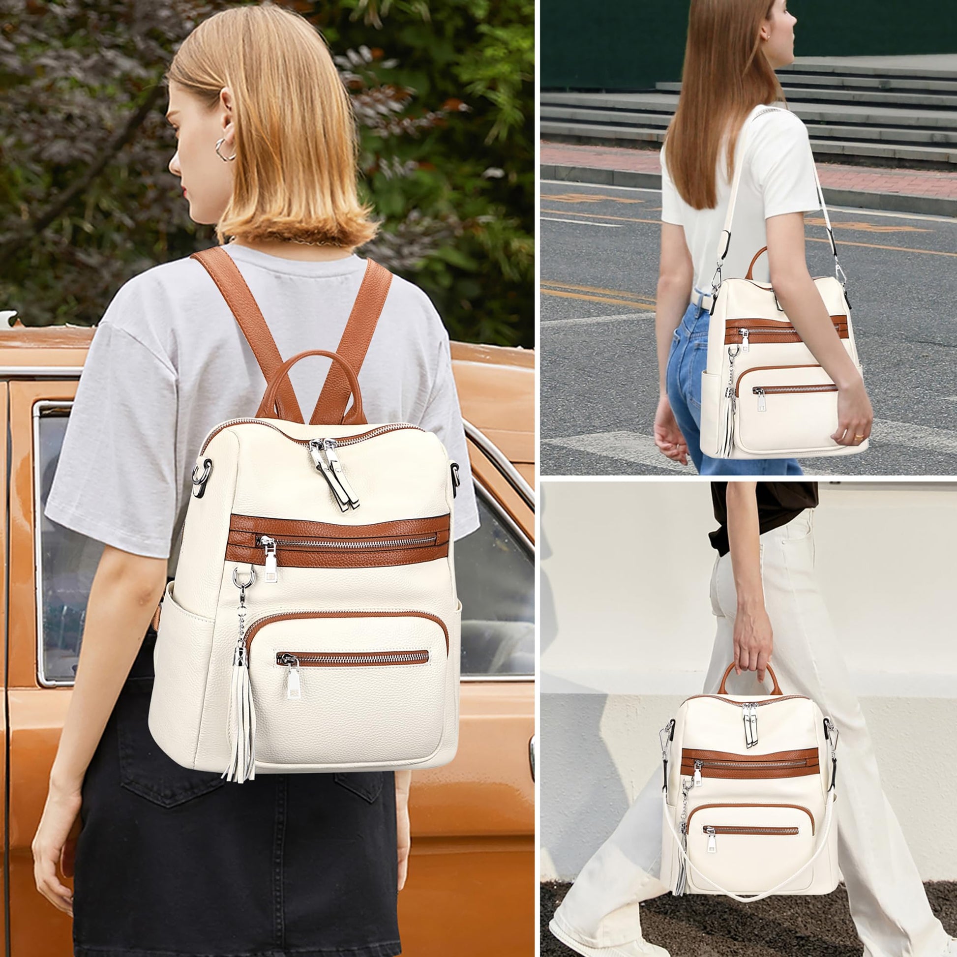 - Convertible Backpack Purse: The bag come with a detachable leather & woven shoulder strap, can be used as shoulder bag or backpack. 1 back zipper pocket for security and privacy. Top double U external zippers are designed for opening in two directions to have a quick access to your items.