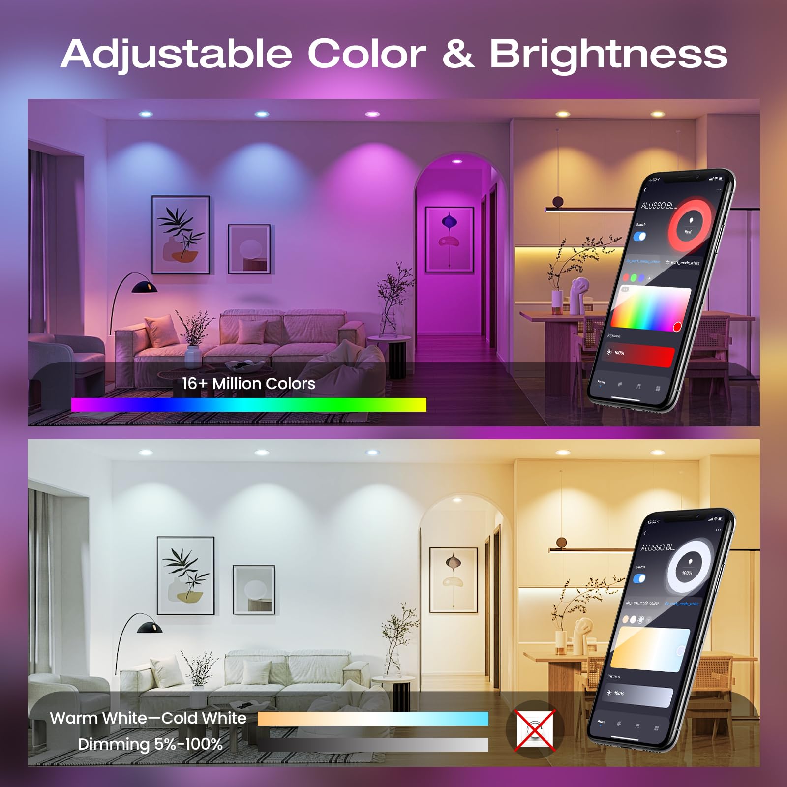 - 【Dual Connectivity】 ALUSSO LIGHTING LED smart recessed lighting supports Wi-Fi and Bluetooth direct control for more convenience. The connectivity options allow a more stable connection, unlike lights that only support Wi-Fi or Bluetooth. If your Wi-Fi drops, Bluetooth keeps working—no more frustrating disconnections. Plus, with Wi-Fi and Bluetooth backing each other up, even if one module fails, you can still control your device the other way. Reliable performance you can count on!