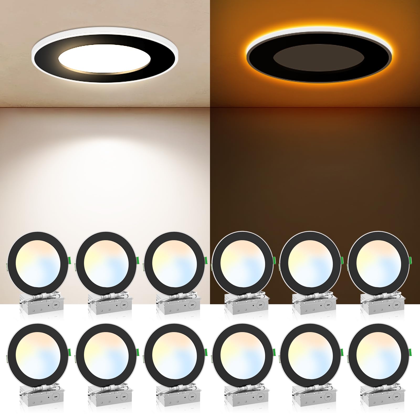 ALUSSO LIGHTING 12 Pack 6 Inch 5CCT Ultra-Thin LED Recessed Ceiling Light with Night Light, 2700K-5000K Selectable, 12W 1100LM Dimmable Canless Wafer Downlight, Damp Rated -ETL&FCC (Black)