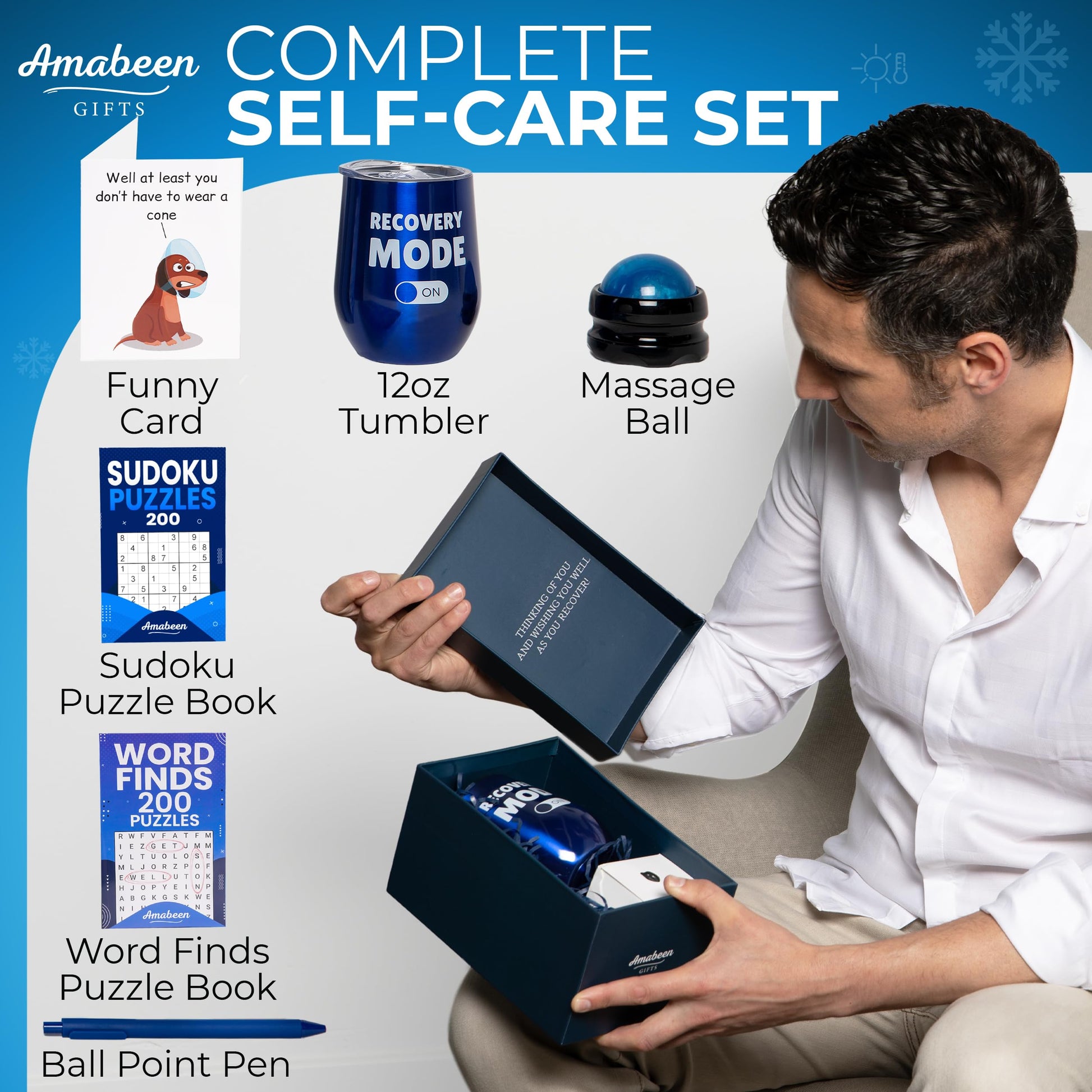 Amabeen Get Well Soon Gift Basket for Men - Funny Card, Insulated Tumbler, Word Finds Puzzle Book, Sudoku, Massager Ball - Recovery & After Surgery Care Package