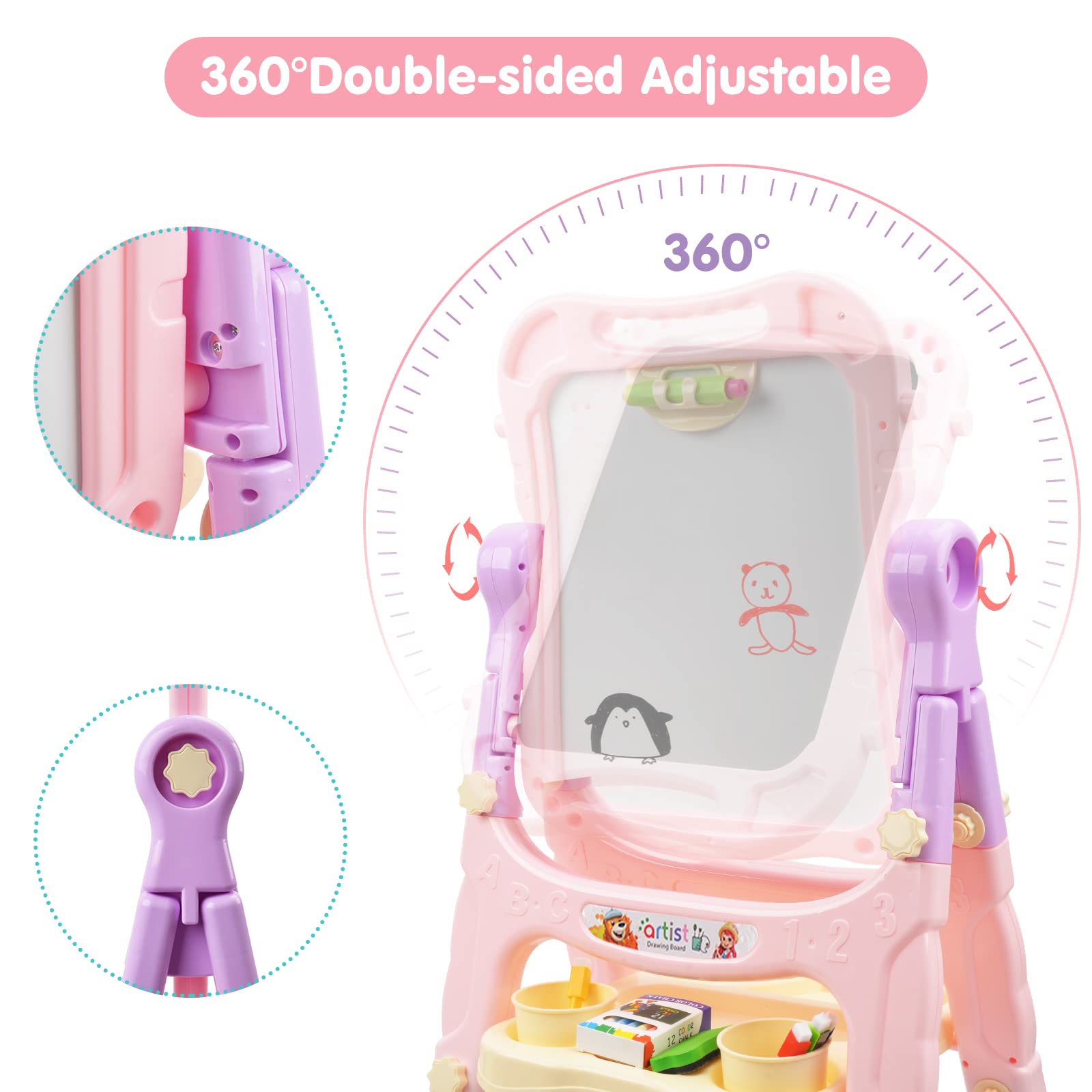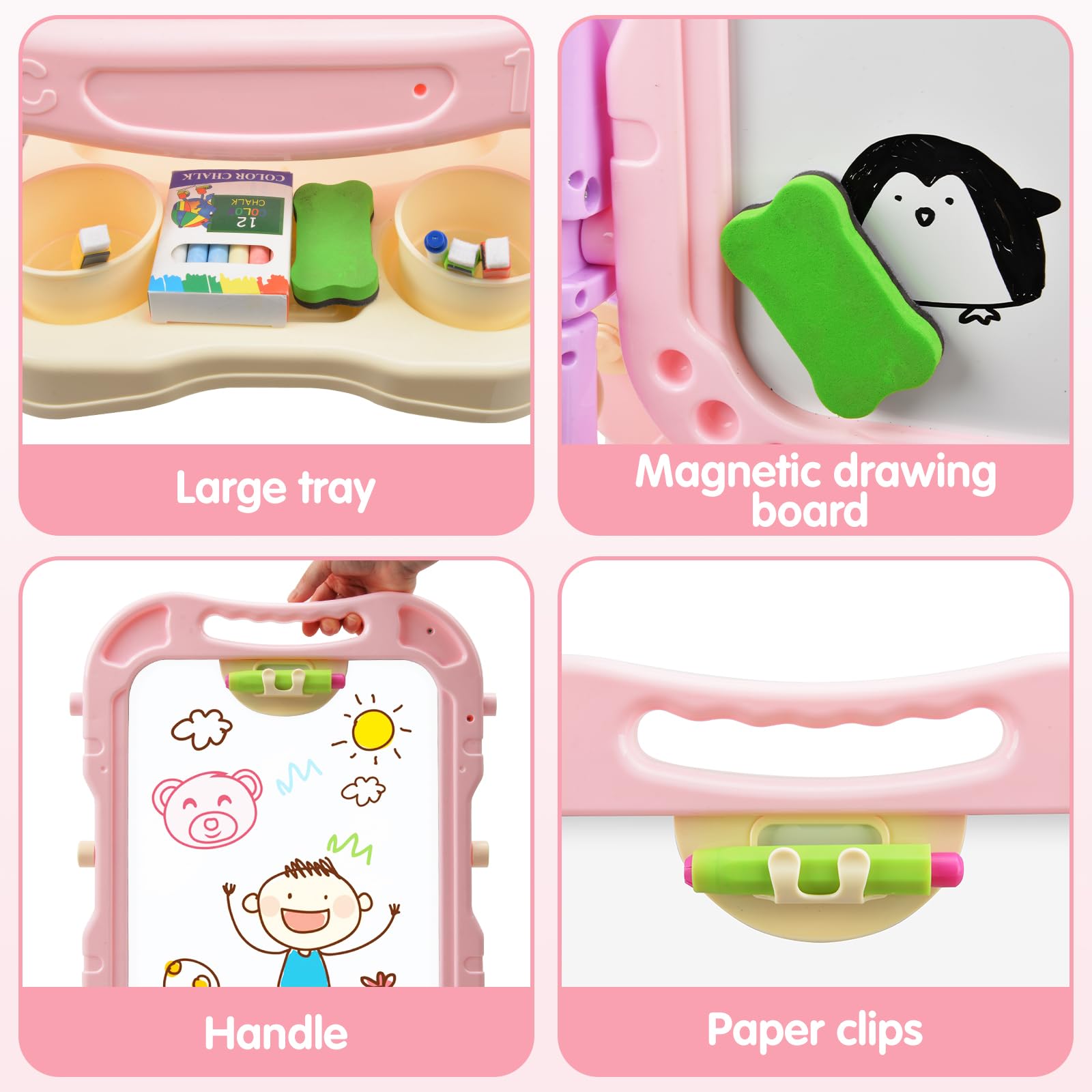 Amagoing Easel for Kids, Adjustable Standing Art Easel for Toddler, Double Side Magnetic Chalk Board with Painting Accessories, Birthday Christmas Gift for Little Boys and Girls Age 3-5, Pink