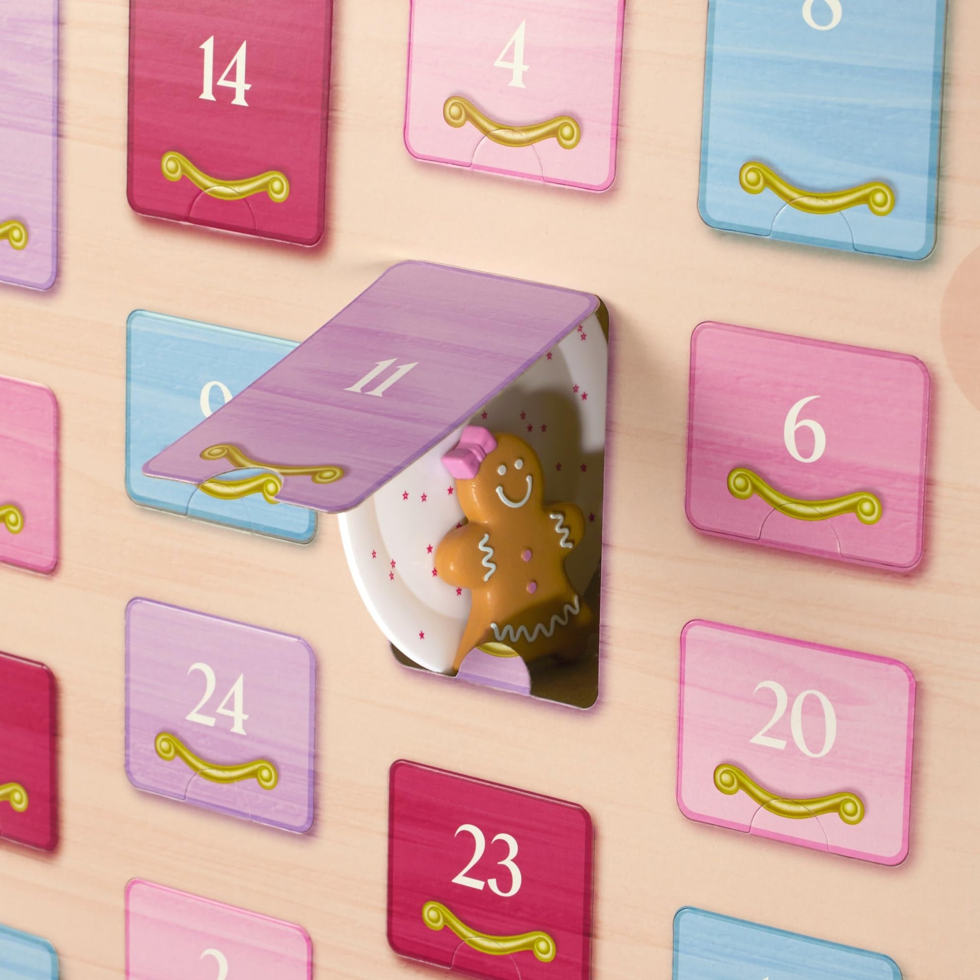 Details: Measure up the fun during the holiday season with daily surprises for festive foodies and bright-eyed bakers. She’ll love opening a door of the gingerbread-themed 2025 24-piece holiday advent calendar each day to reveal baking accessories to sweeten the season Includes Gingerbread goodies: two gingerbread girl cookies with bows, two gingerbread boy cookies with bow ties, two gingerbread cookie cutters that fit over the cookies, a bag of flour with gingerbread cookie recipe instructions on the back, a stick of butter with measurement lines, a container of cinnamon, a bag of brown sugar, a pretend slab of gingerbread dough, a squishy piping bag of white icing, a jar of molasses, and a recipe card with a real recipe for gingerbread cookies. Seasonal kitchen staples: a doll half-apron with a festive red print, a red mixing bowl with a snowflake design, a ring of three colorful measuring spoons, a faux wooden mixing spoon with a red handle, a red-and-white striped rolling pin, a pink spatula, a white plate with a red star print, and a silvery baking sheet. Cocoa coziness: a light-blue mug of cocoa with whipped cream and a light-pink mug of cocoa with whipped cream.