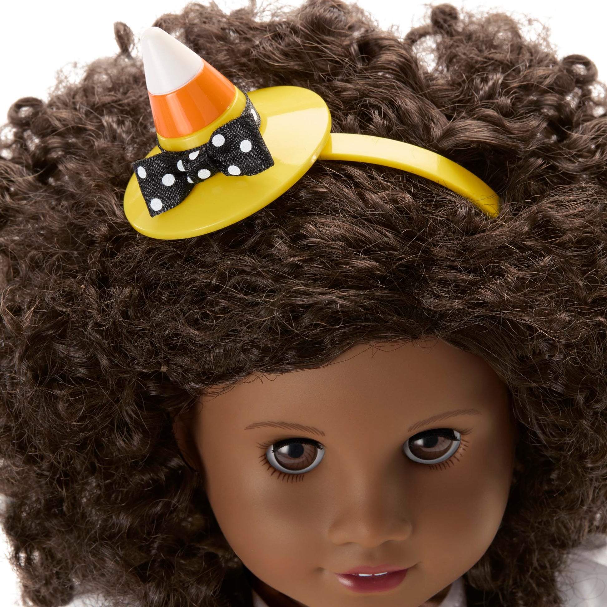 - A headband with an attached witch hat in candy-corn colors and a black-and-white polka-dot band with a bow
