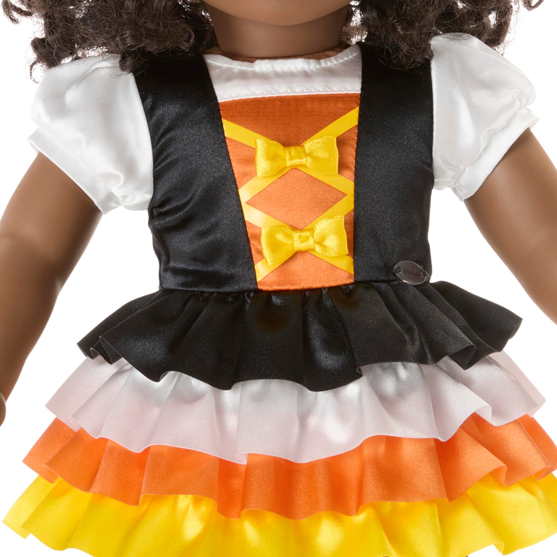 - A dress with a black satin bodice with dimensional bows, white satin puff sleeves, and a four-layer satin skirt in candy-corn colors