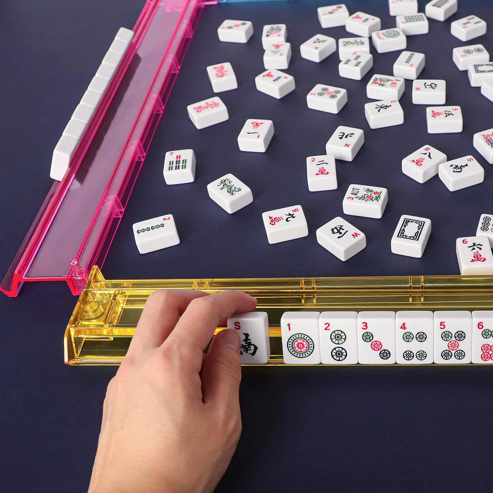 - MAHJONG ACCESSORIES: This American Mahjong set comes with four colorful integrated tile racks and pushers(no assembly required) that help you arrange the tiles neatly during the game and easily collect them afterward. It also includes 3 dice, a set of colorful chips, a wind indicator, and a Mahjong manual to assist beginners.