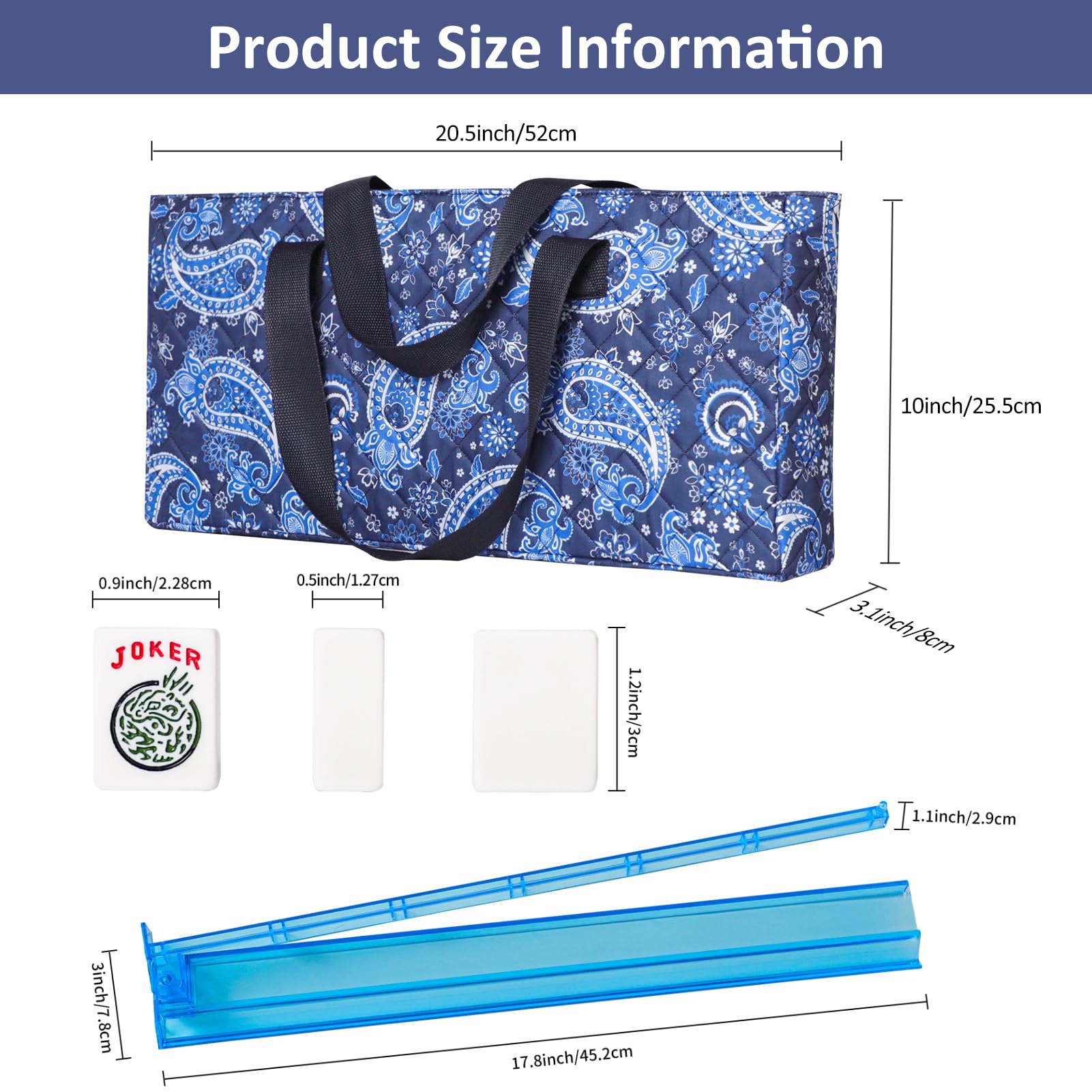 - Stylish and Portable Blue Bag: This printed bag is designed in a chic deep blue accents. It includes one pockets for convenient storage of Mahjong accessories. The smooth sided zipper ensures easy access to tiles and tile racks.