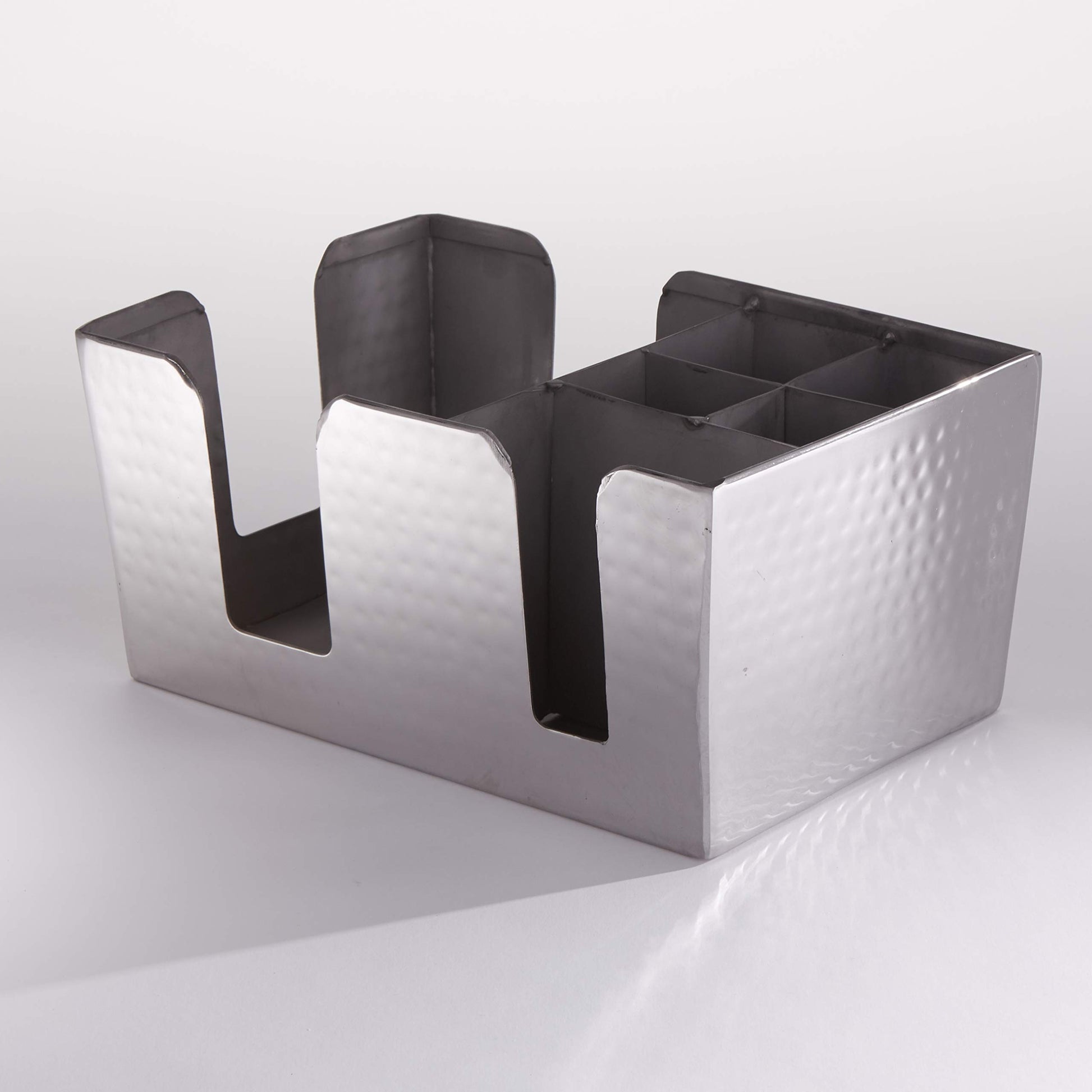 Details: Easily organize all your bar essentials with American Metalcraft’s Hammered Stainless Steel Bar Caddy! Made of durable stainless steel for years of everyday use, this caddy offers 6 compartments for holding napkins, straws, stirrers, utensils, and condiments. A must-have for any bar or restaurant, this caddy’s hammered steel design adds a sharp, unique look while offering compact organization. The lightweight design makes cleaning simple and quick. Each order contains one caddy measuring 8.5” L x 5.75” W x 4.5” H. With 70 years of service, American Metalcraft is a leader in the foodservice industry for trend-focused and unique products.