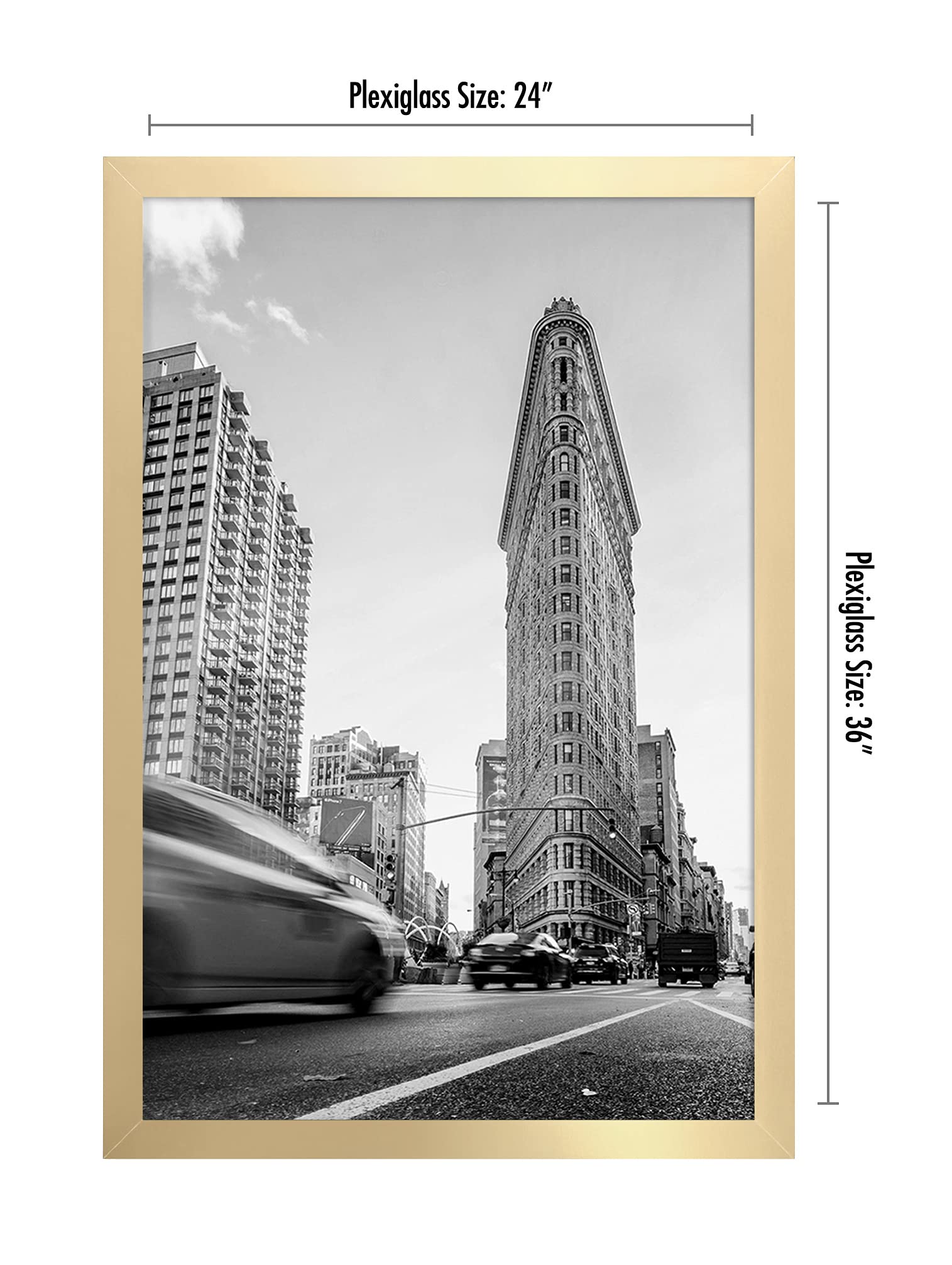 Details: Give your memories the frame they deserve with our Americanflat 24x36 picture frame. Crafted from durable engineered wood (MDF) with a sleek, wide molding, this is more than a picture frame; it’s a game changer for your decor. The polished plexiglass front offers a crystal-clear view while protecting your photos, posters, or artwork from dust and scratches. Because your favorite moments deserve nothing less than perfection. Versatility meets style with these gold frames. Hang it vertically or horizontally using the included hanging hardware, and make it the perfect fit for any wall. It's an ideal way to showcase your cherished photos anywhere in your home or office. No matter how you style it, the gold finish adds a timeless touch, instantly elevating your space. Refreshing your display has never been easier. The easy-to-open turn buttons make swapping photos a breeze, so you can update your walls as often as you like. Plus, the sturdy backboard keeps everything securely in place, ensuring your memories always look their best. Why settle for boring walls when you can have a gallery at home? This photo frame is built to last, combining style and functionality to create keepsakes you’ll treasure forever. Order yours today and join thousands of satisfied customers who’ve transformed their spaces with Americanflat.