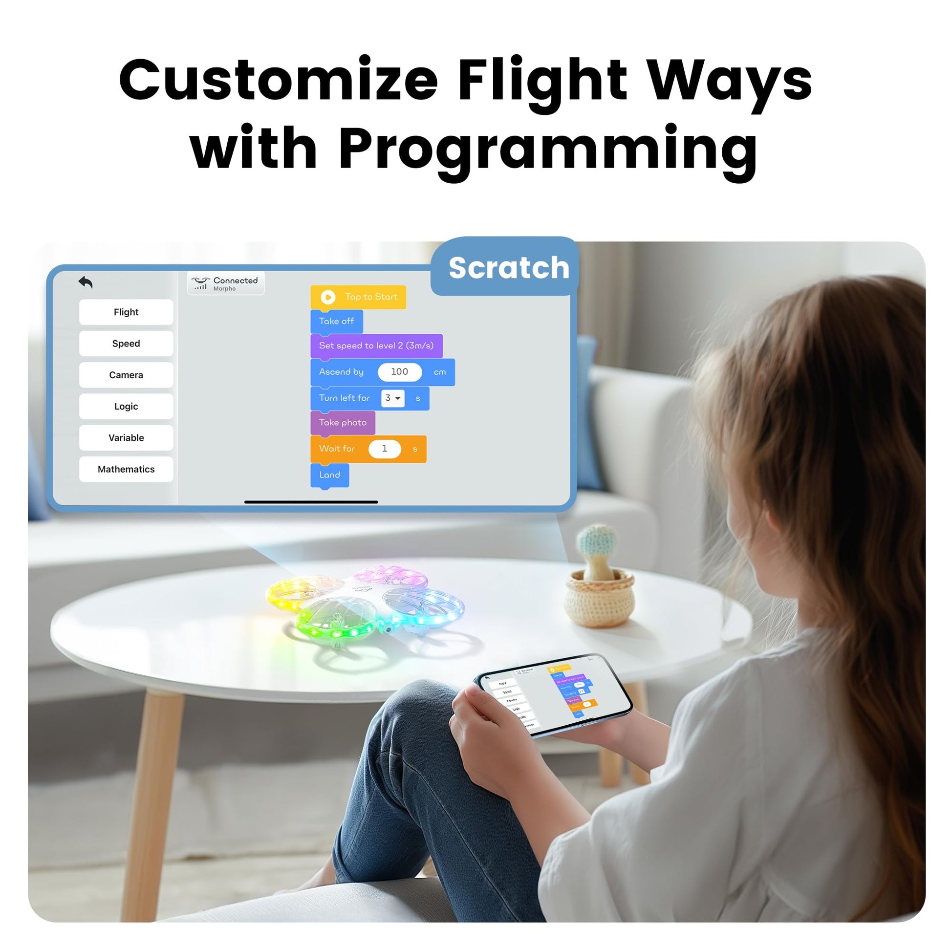 - Simple STEM Toys: Drag the desired flying building blocks into the STEM module of the APP, then press the start button, and the drone will start flying according to the built building blocks. The APP is compatible with iOS and Android systems