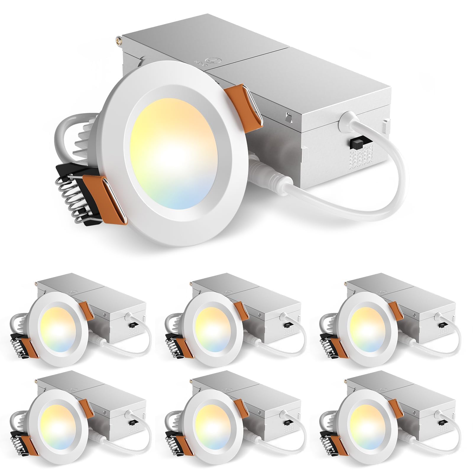 Amico 6 Pack 2 Inch 5CCT Ultra-Thin LED Canless Recessed Ceiling Light with Junction Box, 2700K/3000K/3500K/4000K/5000K Selectable, CRI90+, 6W=40W, 350LM, Dimmable Canless Wafer Downlight-ETL&FCC