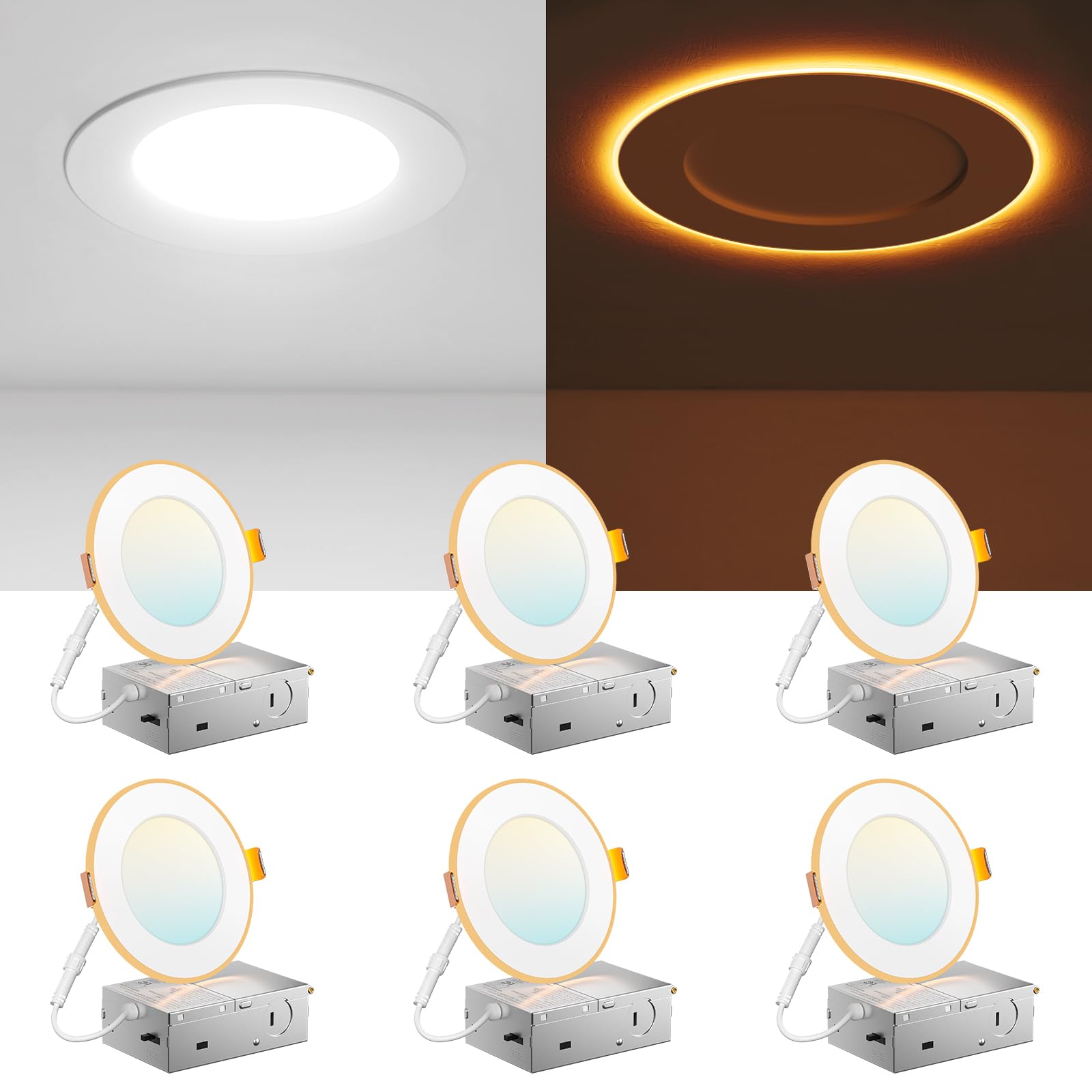 Amico 6 Pack 4 Inch 5CCT LED Recessed Ceiling Light with Night Light, 2700K/3000K/3500K/4000K/5000K Selectable Ultra-Thin Recessed Lighting, 10W=90W, 700LM, Dimmable Canless Wafer Downlight - ETL&FCC