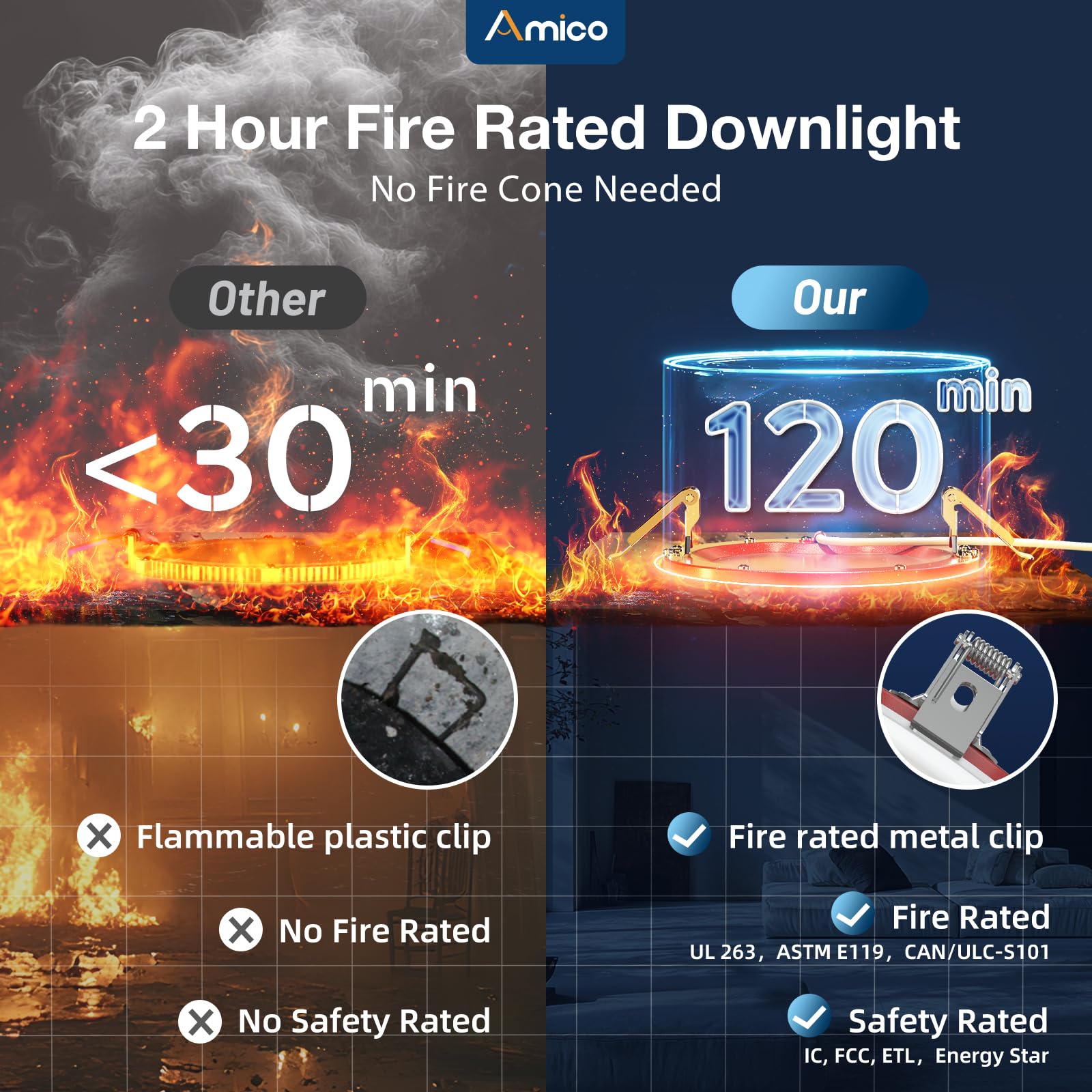 - Amico Benefits: Amico fire rated recessed downlights are damp-rated, offers fire-resistant lighting for bedrooms, living rooms, kitchens, hallways, and even bathrooms. Our recessed lighting are certified by ETL FCC Energy Star of a high standard.