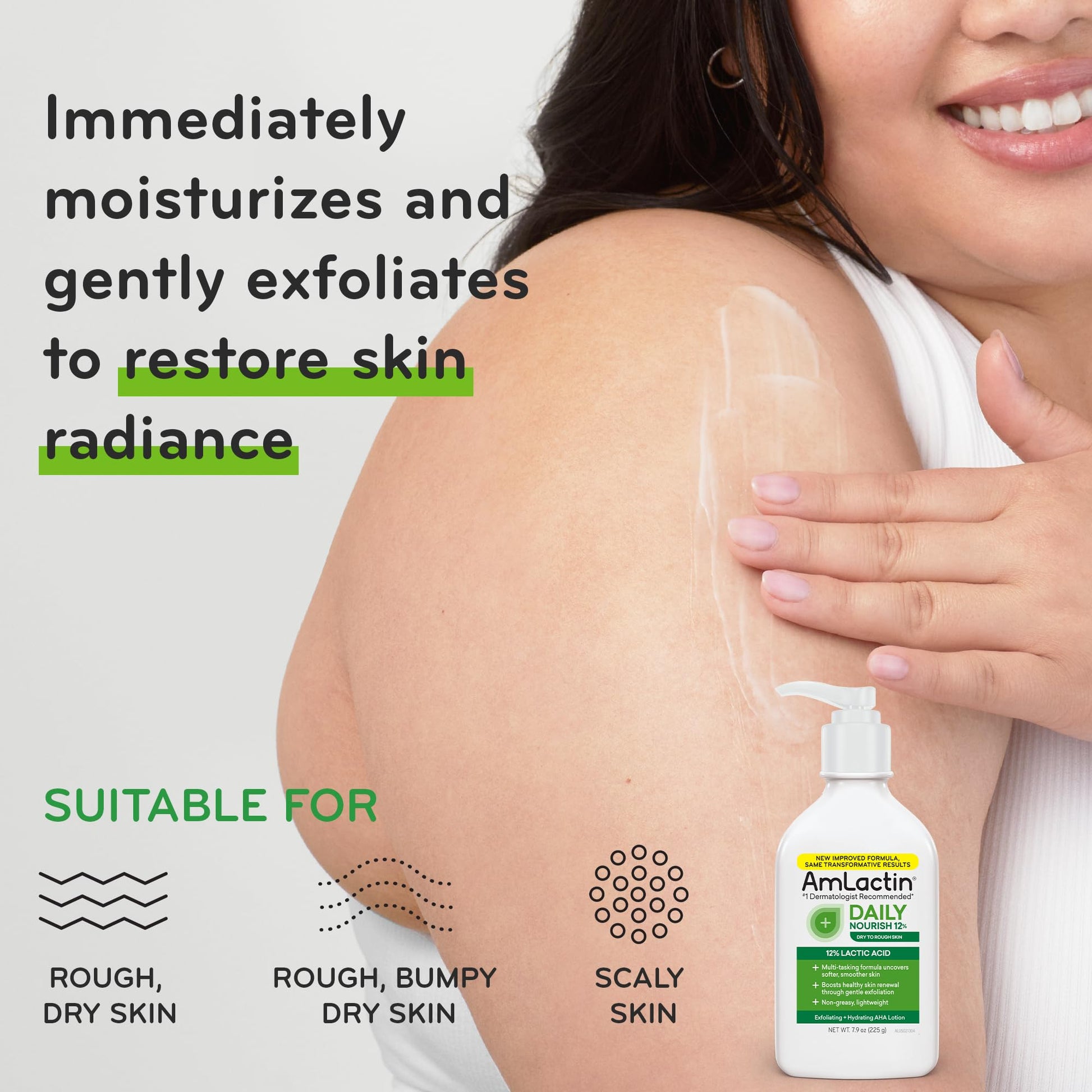 - Daily Nourish Lotion: Our therapeutic formula leverages 12% lactic acid, a gentle yet effective AHA that exfoliates to promote skin cell turnover while hydrating to boost daily skin radiance; suitable as a face, hand & body lotion