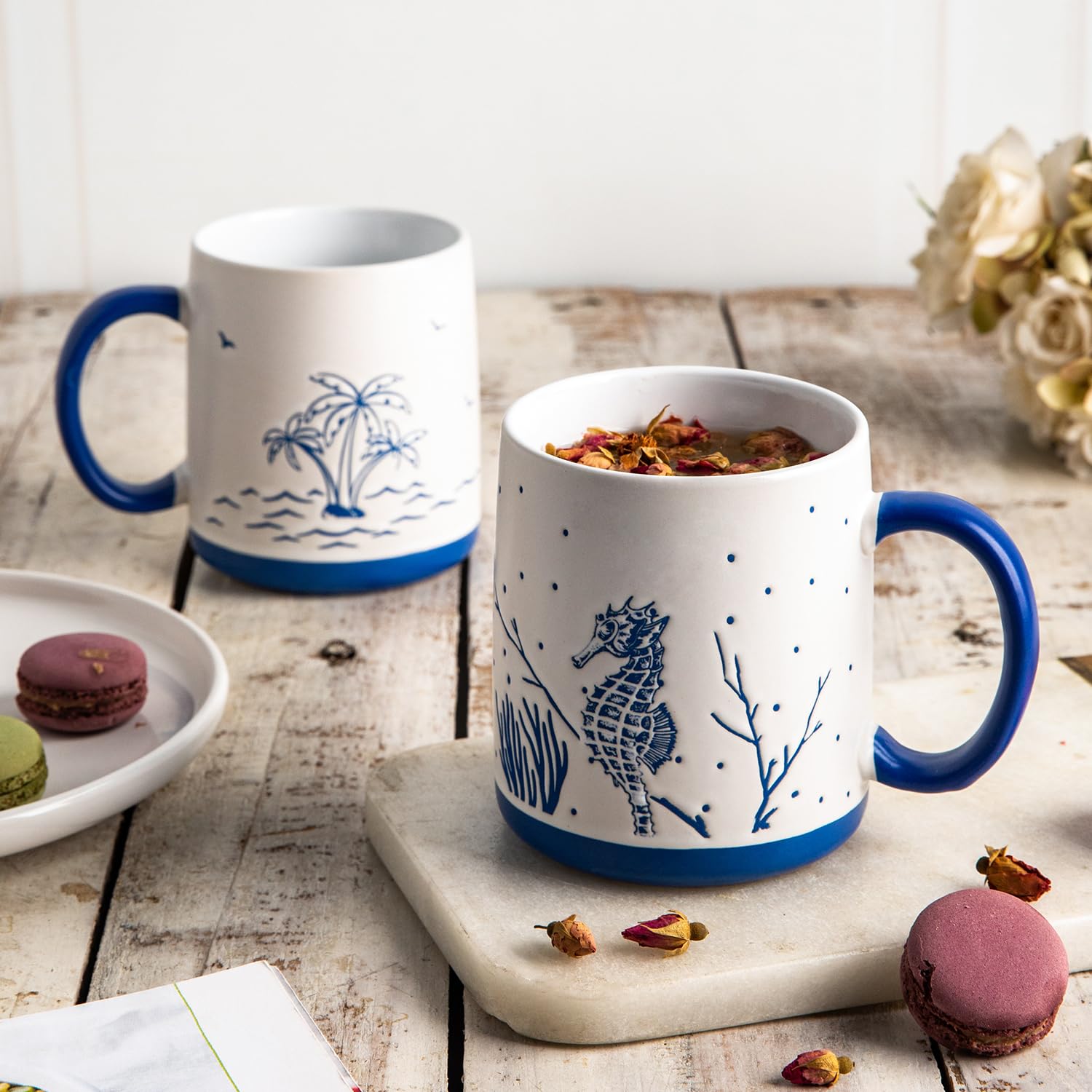 AmorArc Large Coffee Mugs Set of 6, 18oz Ceramic Coffee Cups with Sea Life Textured Patterns for Tea Latte Cocoa. Easy to Hold&Clean, Dishwasher&Microwave Safe, Matt White