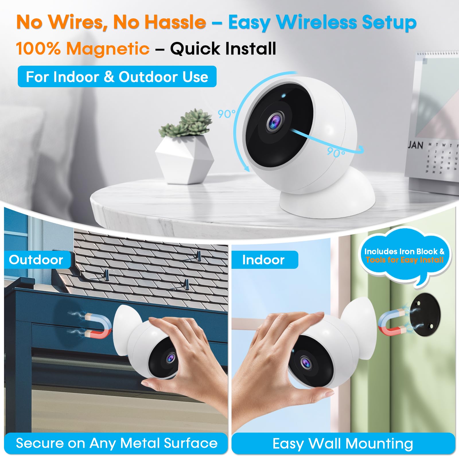 - Magnetic Mount – Quick and flexible placement on metal surfaces. Includes iron blocks and screws for installation on non-metal surfaces (walls, wood, doors)