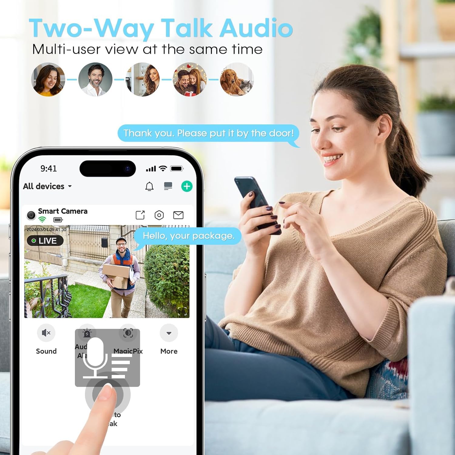 - Two-Way Audio – Talk and listen through the camera, whether you’re at home or away. Great for communicating with delivery drivers, pets, or family members