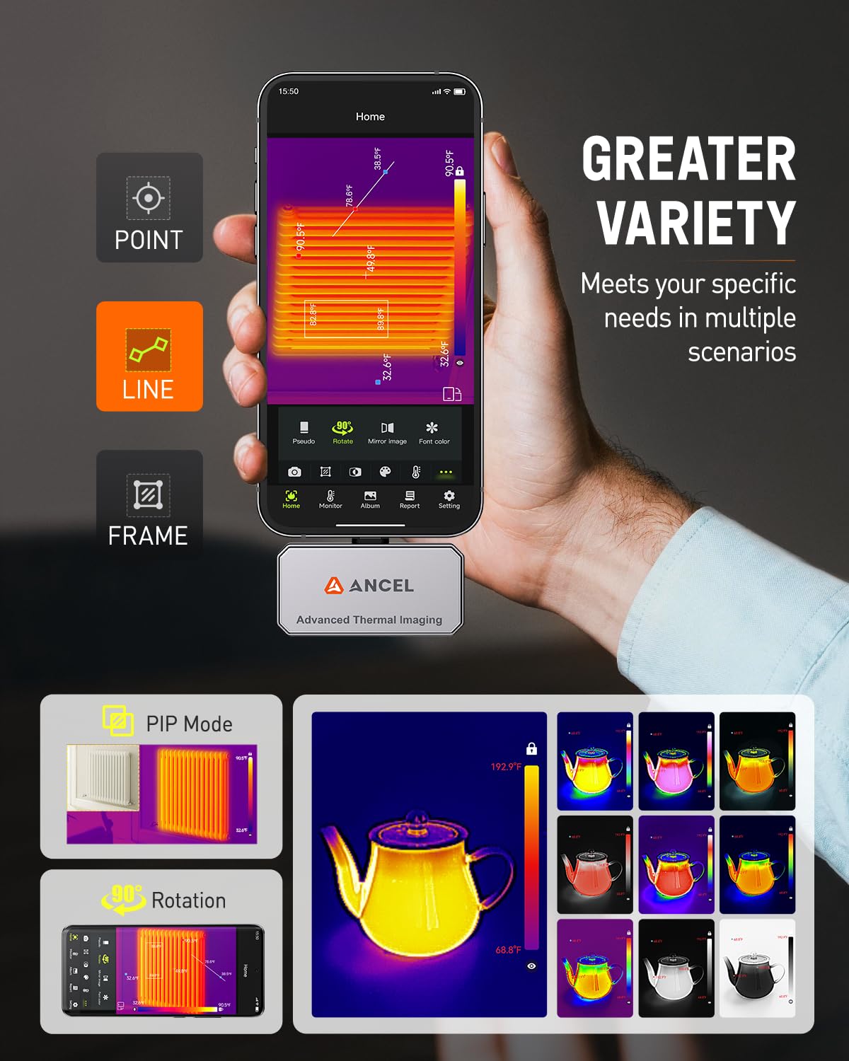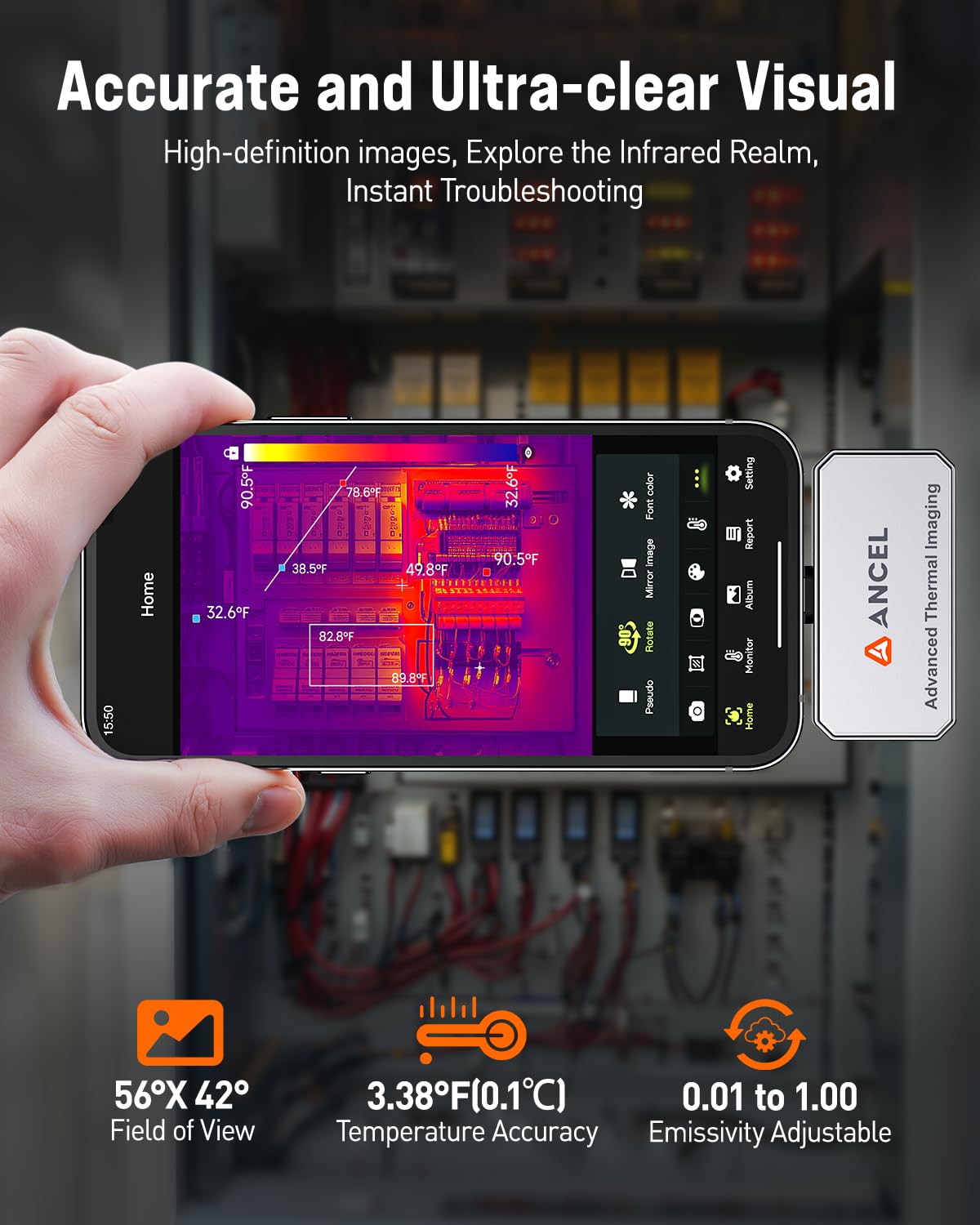 - 📱Engineered for iPhone – Smarter, Lighter, Wireless: The ANCEL IR101 is a professional-grade thermal imaging camera tailored for iPhones(Note: iPhone 15 and newer models require an additional adapter)—offering superior portability over bulky handheld devices. Simply plug and play to view, record, and analyze thermal data through your phone. Whether you're diagnosing HVAC failures, checking electrical panels, or hunting for air leaks at home. Ideal for professionals and serious DIYers who need top-tier performance without carrying extra gear