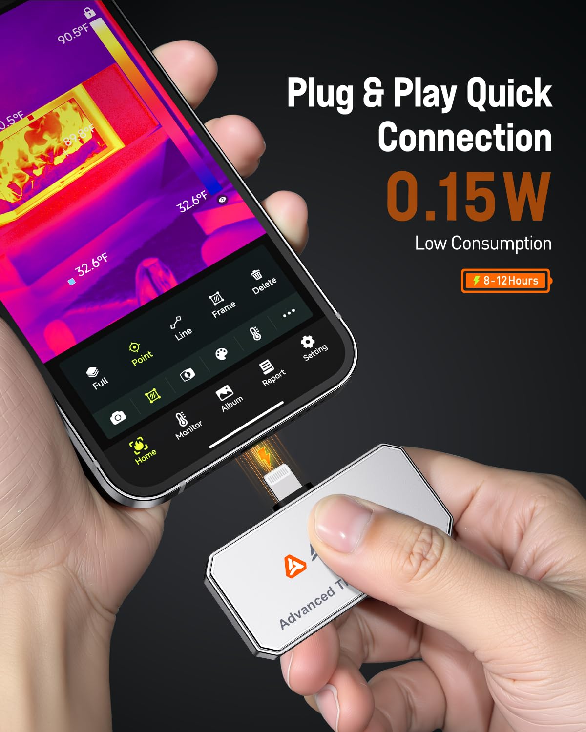 - 🔋 30% Lower Power Use – 10 Hours Continuous Work: Power-efficient without compromise. Unlike traditional models that consume 0.35W or more, the IR101 thermal imager draws just 0.24W, meaning it runs cooler and longer—up to 10 hours on a standard 5000mAh iPhone battery. No built-in battery, no need for charging—just plug in and go. Whether you’re on a multi-site inspection or out in the field all day, IR101 stays ready without draining your phone. Fewer interruptions, less heat buildup, and more reliable data when you need it most