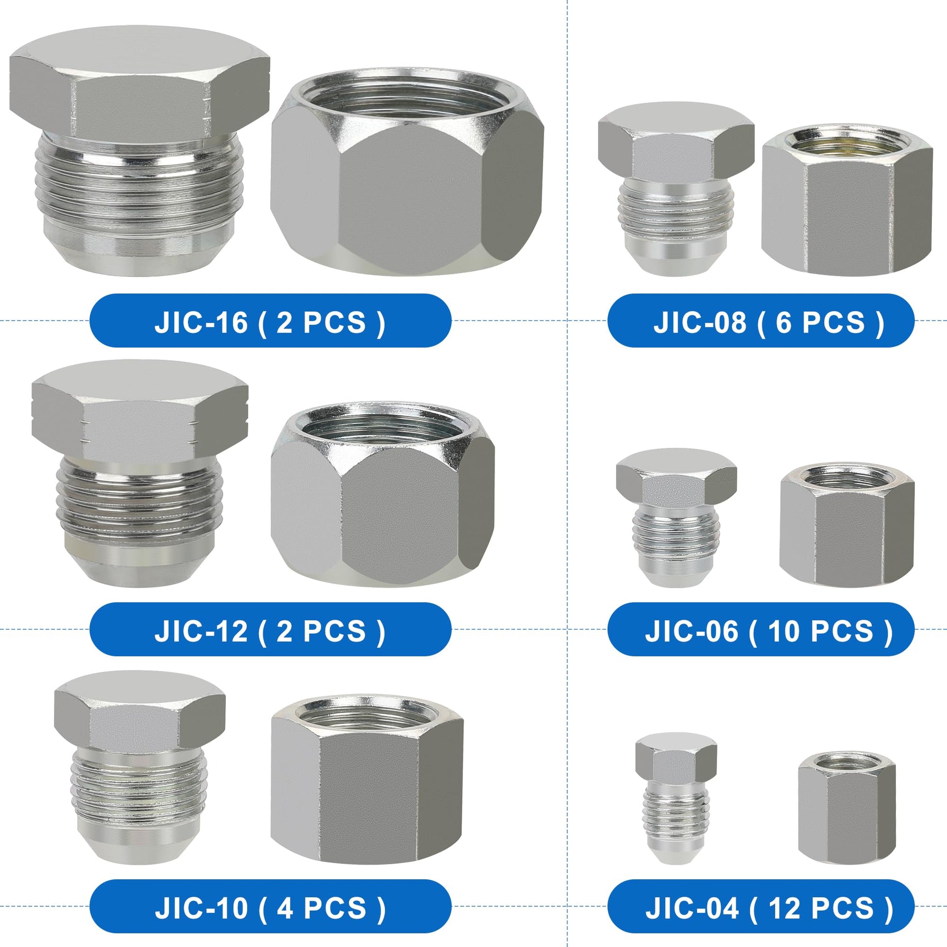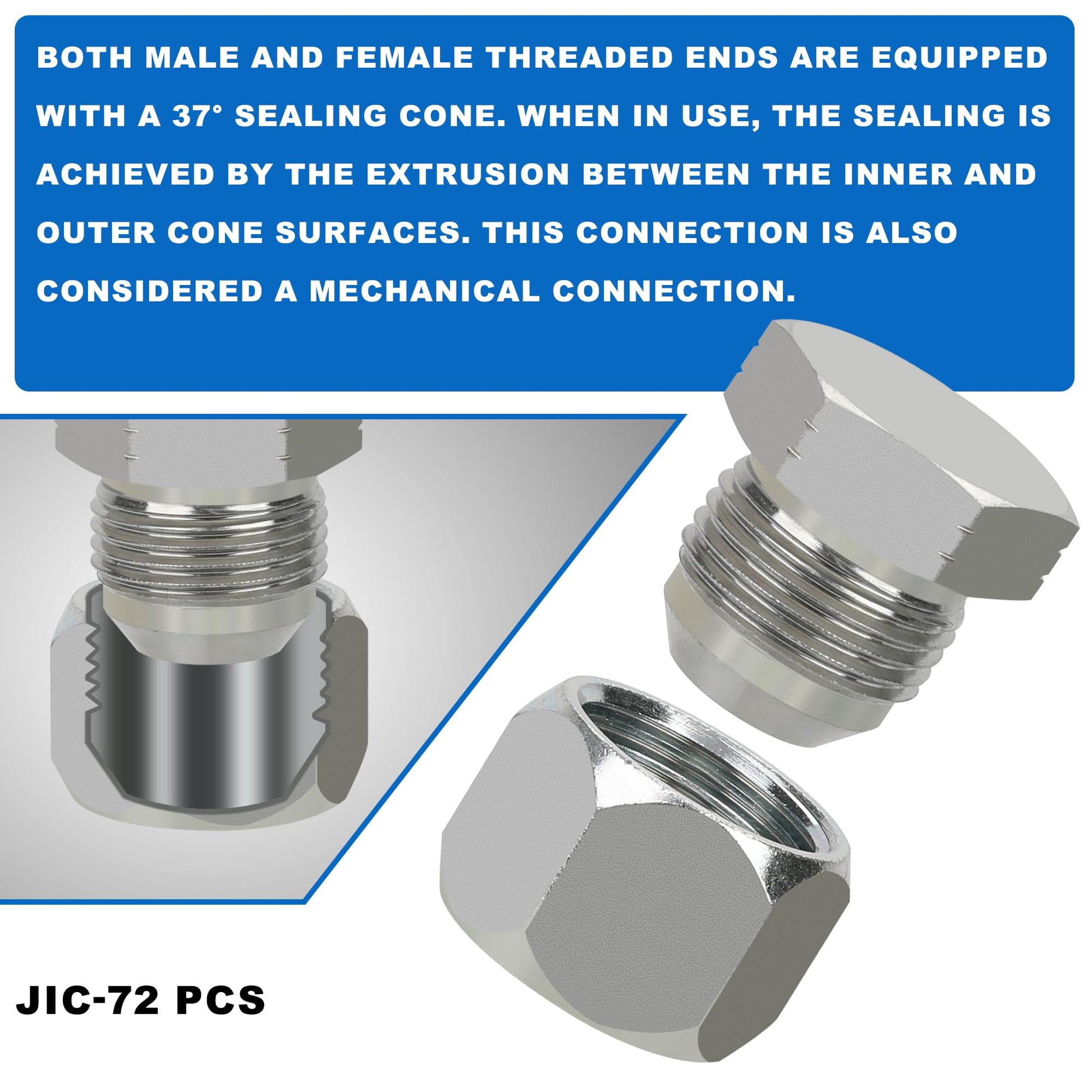ANCIMOON 72PCS JIC Cap and Plug Set, 37 Degree Flare Threads Hydraulic Hose Fittings, Carbon Steel, Size 4 6 8 10 12 16