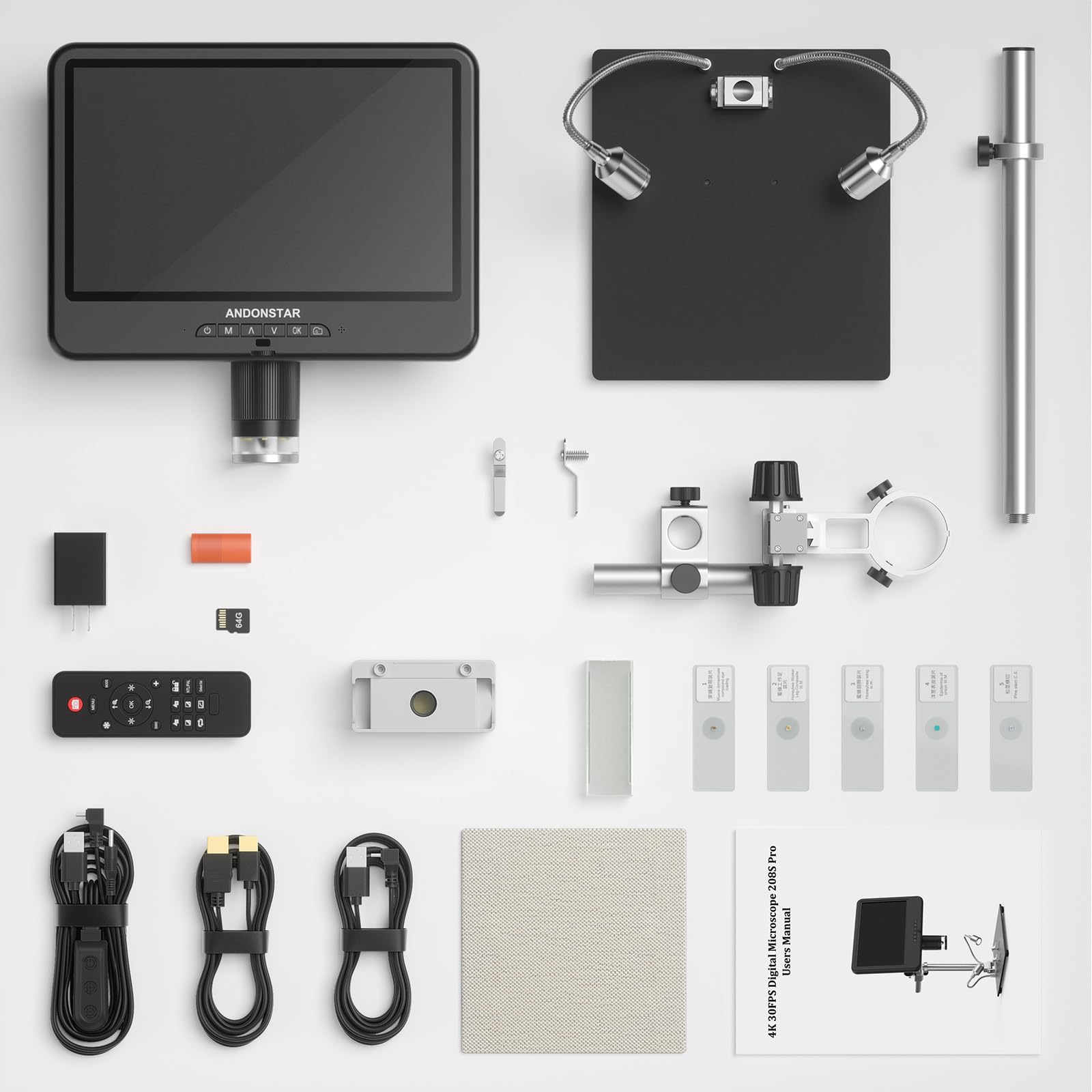 - 【What You Can Get】10-inch IPS Microscope Monitor, Metal Base, Column, Pro Boom Arm Beam, Clips, Slides Kit, Bottom Light Stage, Remote, Adapter, 64GB SD Card, Card Reader, Switch Cable, USB Cable, HDMI Cable, Cleaning Cloth, User Manual, and 24-hour professional after-sales service.
