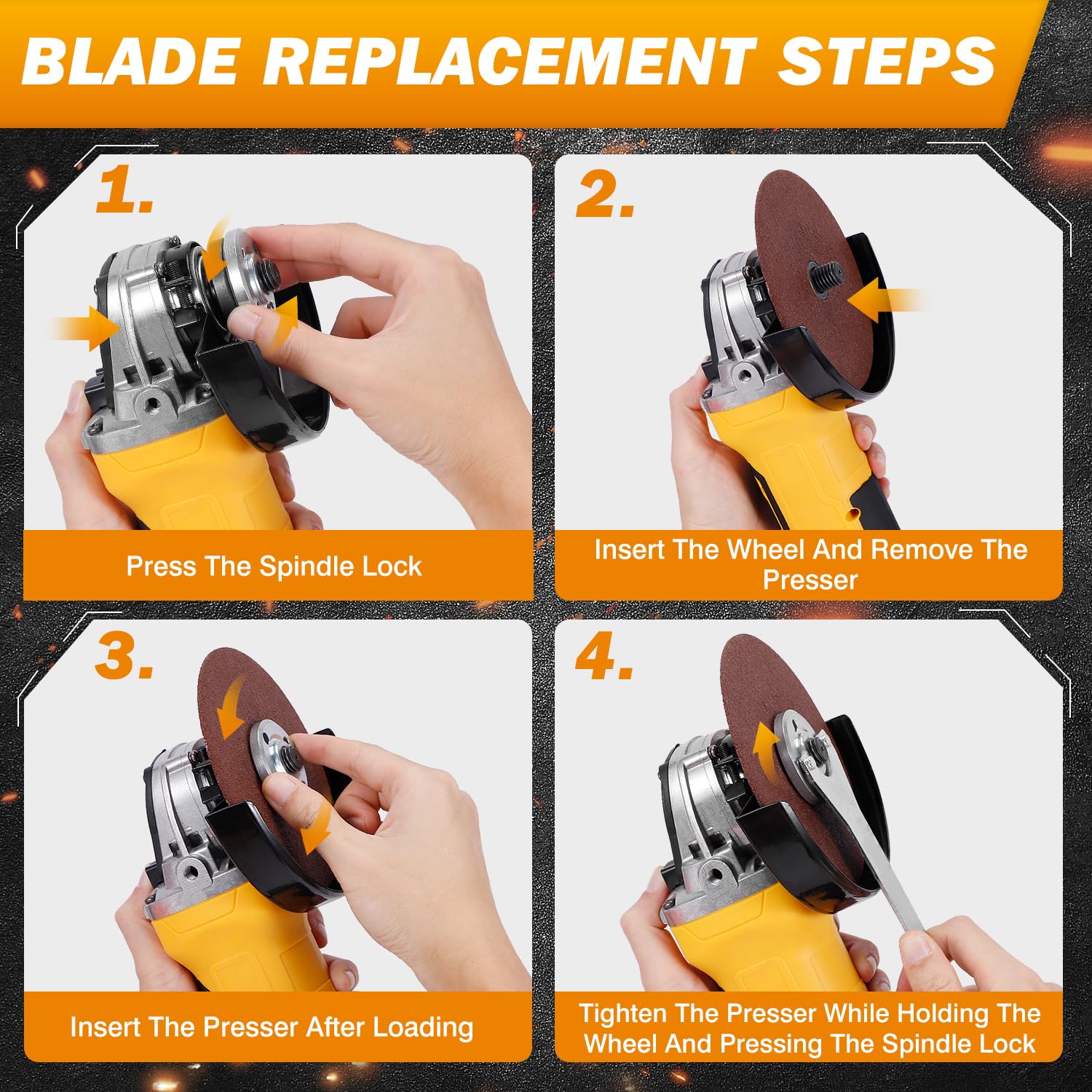 - 【Brushless and 4-speed control】 The electric angle grinder has 4-speed control, variable speed from 3000 to 7200 RPM, which can efficiently complete grinding, cutting and polishing. The brushless motor has a longer life, higher output, less wear and tear, and lower energy consumption, providing users with better performance and longer service life.