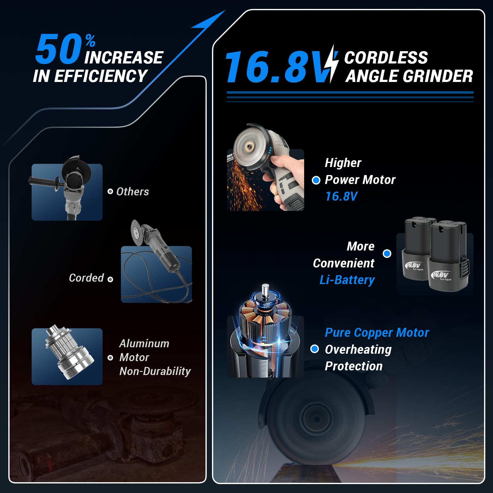 - Sturdy/Anti-Splash: 16.8V powered grinder has a brushed motor design and is powered by lithium battery, so you can charge it anytime, anywhere. The ventilation holes in the shell can better dissipate heat during work and prevent the machine from overheating. The thickened baffle plate can avoid workpiece debris splashing into the machine and causing machine damage, effectively extending the life of the machine. Weighing only 1.1kg, it can be used by men or women with one hand.
