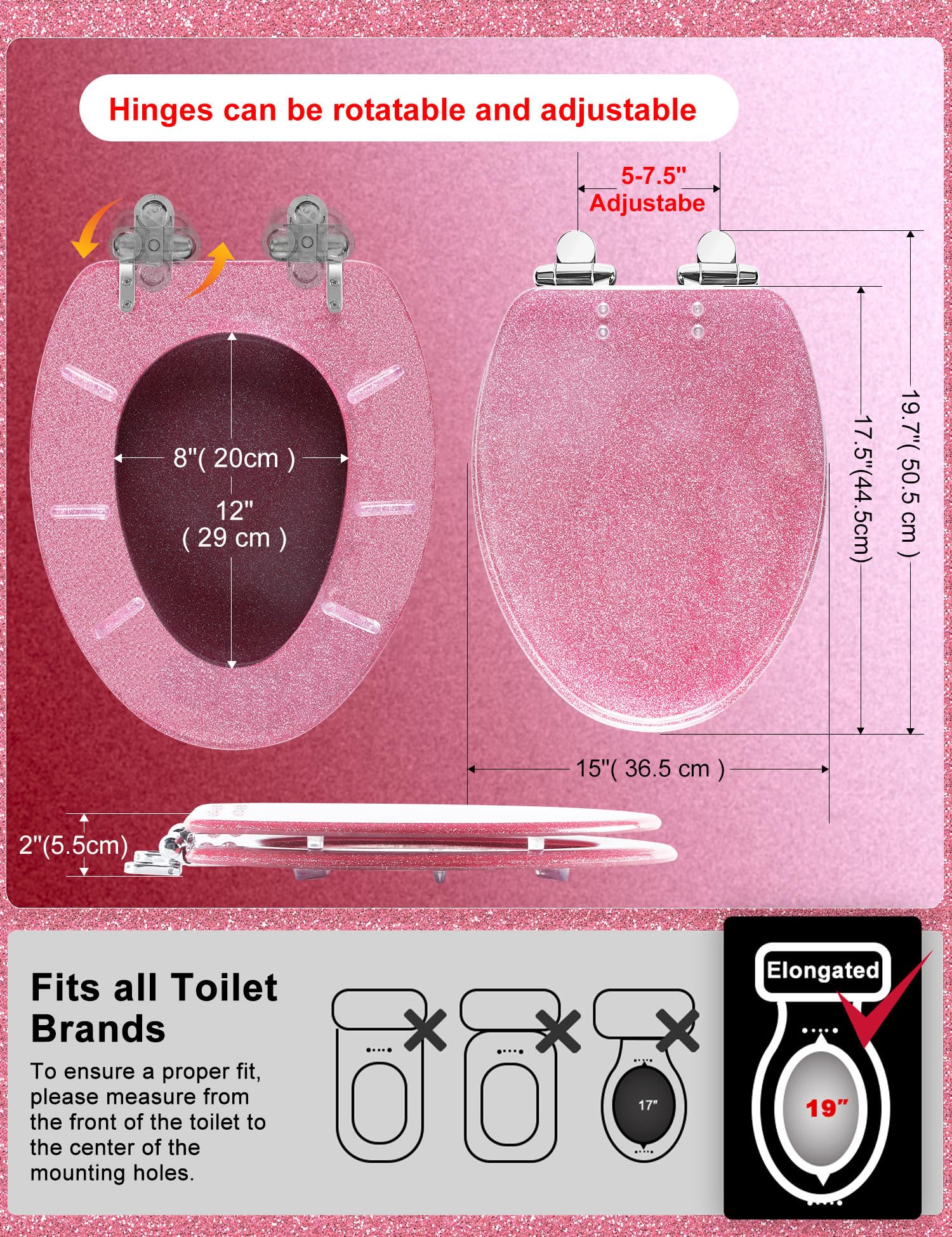 Angol Shiold ELONGATED Pink Toilet Seat Resin Glitter, Slow Close Heavy Duty Acrylic Toilet Seats for Standard Toilets, Easy Installation & Cleaning(19Inch, Pink Glitter, Upgraded hinges)