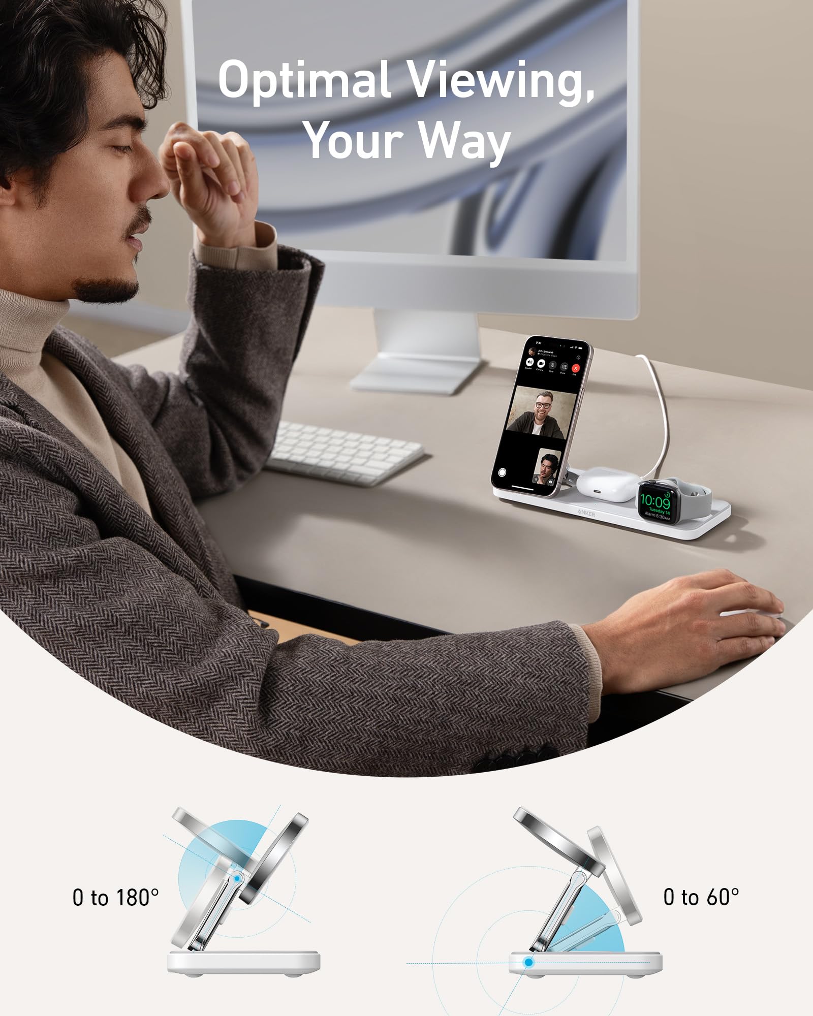 Anker iPhone 16 Foldable 3-in-1 Wireless Charging Station, Qi2 Certified 15W Ultra-Fast MagSafe-Compatible Wireless Charger, for iPhone 15/14 Series, AirPods, Apple Watch (USB-C Charger Included)
