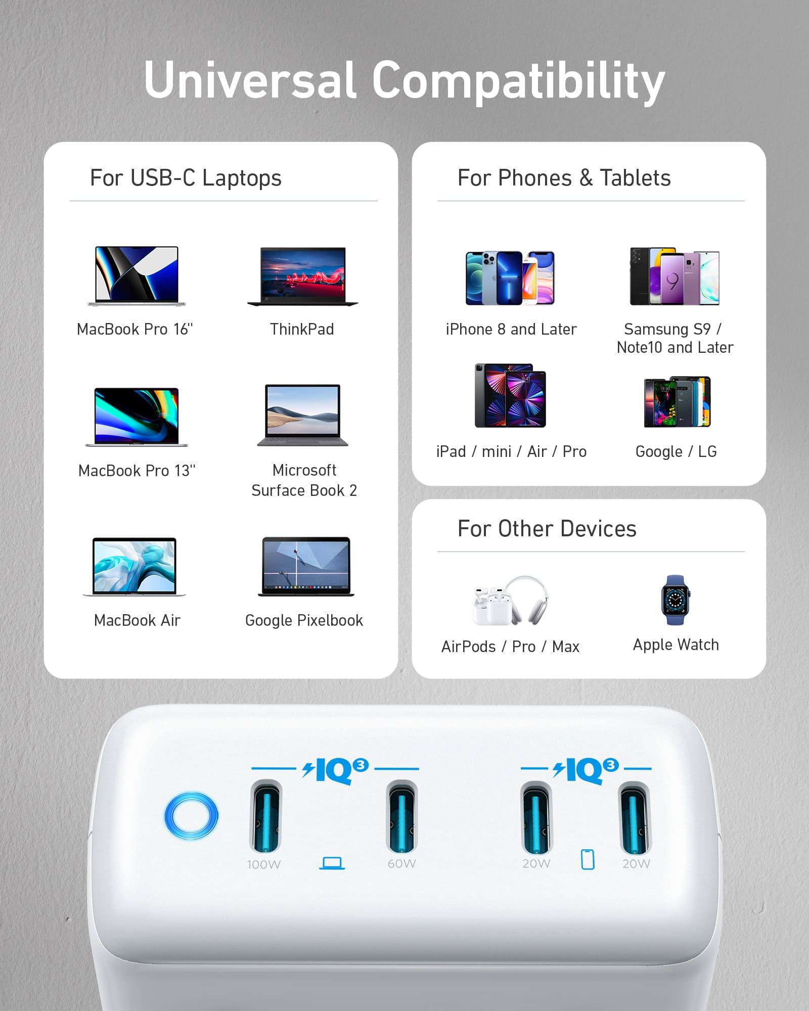 Anker USB C 120W, 547 Charger, PowerPort III 4-Port Charging Station for MacBook Pro/Air, iPhone iPhone 15/15 Plus/15 Pro/15 Pro Max/14/13 Series, Galaxy, Pixel 4/3, iPad Series, and More Devices