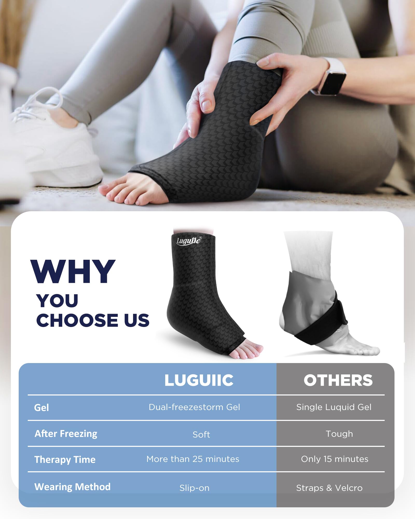 - 【Enhanced Cooling with Focus Support】Luguiic FreezeStorm's advanced gel technology delivers even, targeted cooling directly to your ankle. The gel contours perfectly to your joint, ensuring maximum contact for deep, consistent cold therapy. Whether you're recovering from a sprain, surgery, or chronic pain, Luguiic FreezeStorm's focused cooling accelerates ankle repair and gets you back on your feet faster.