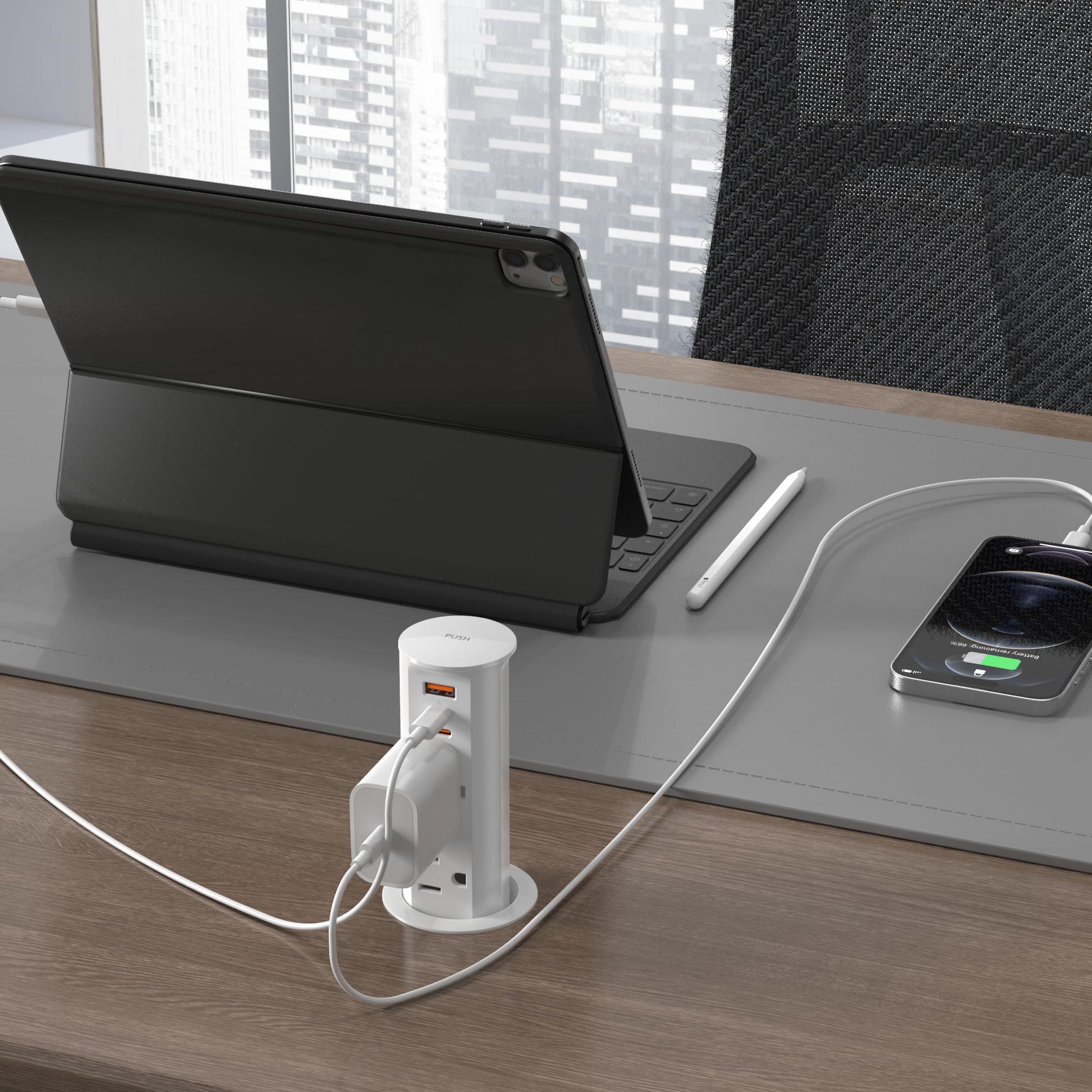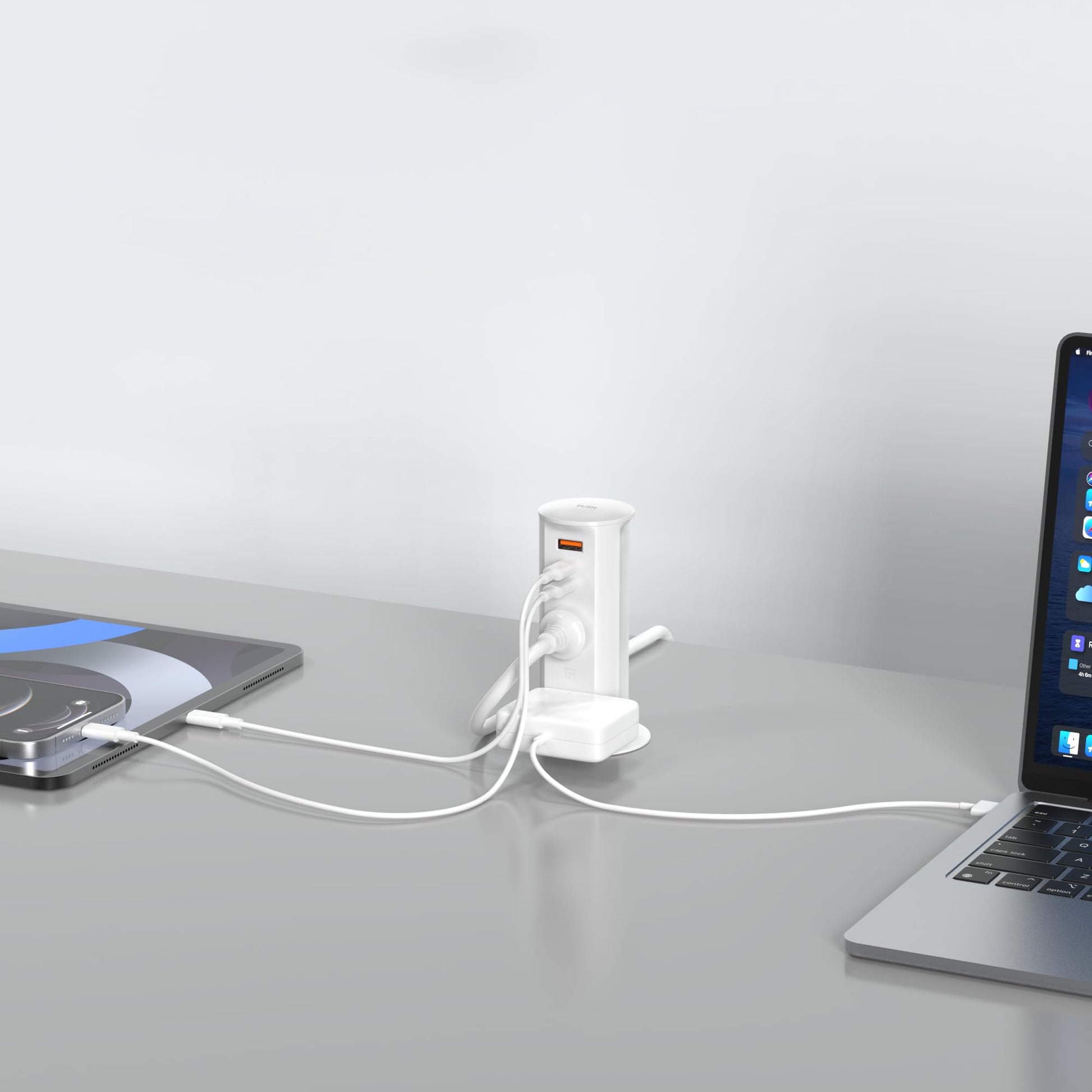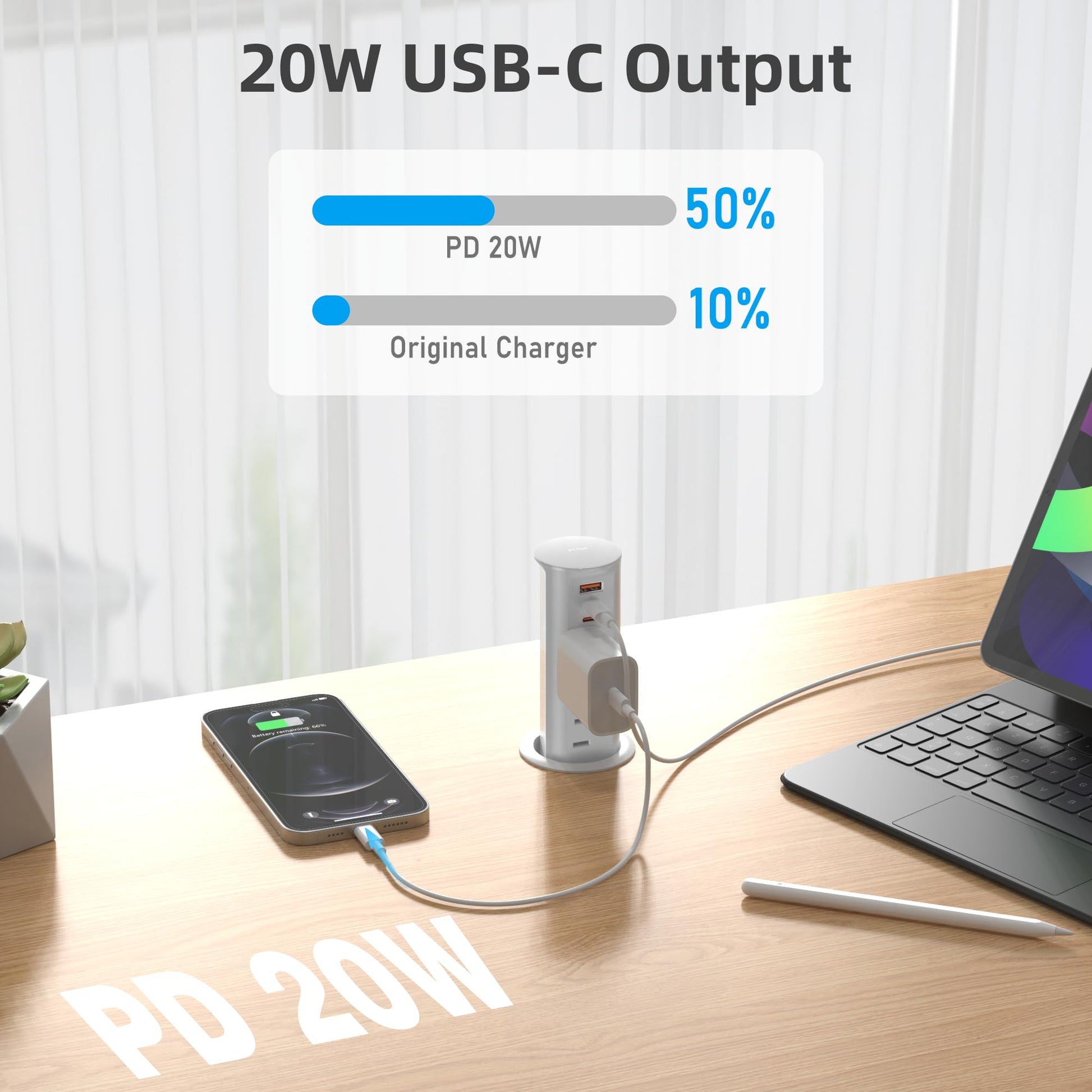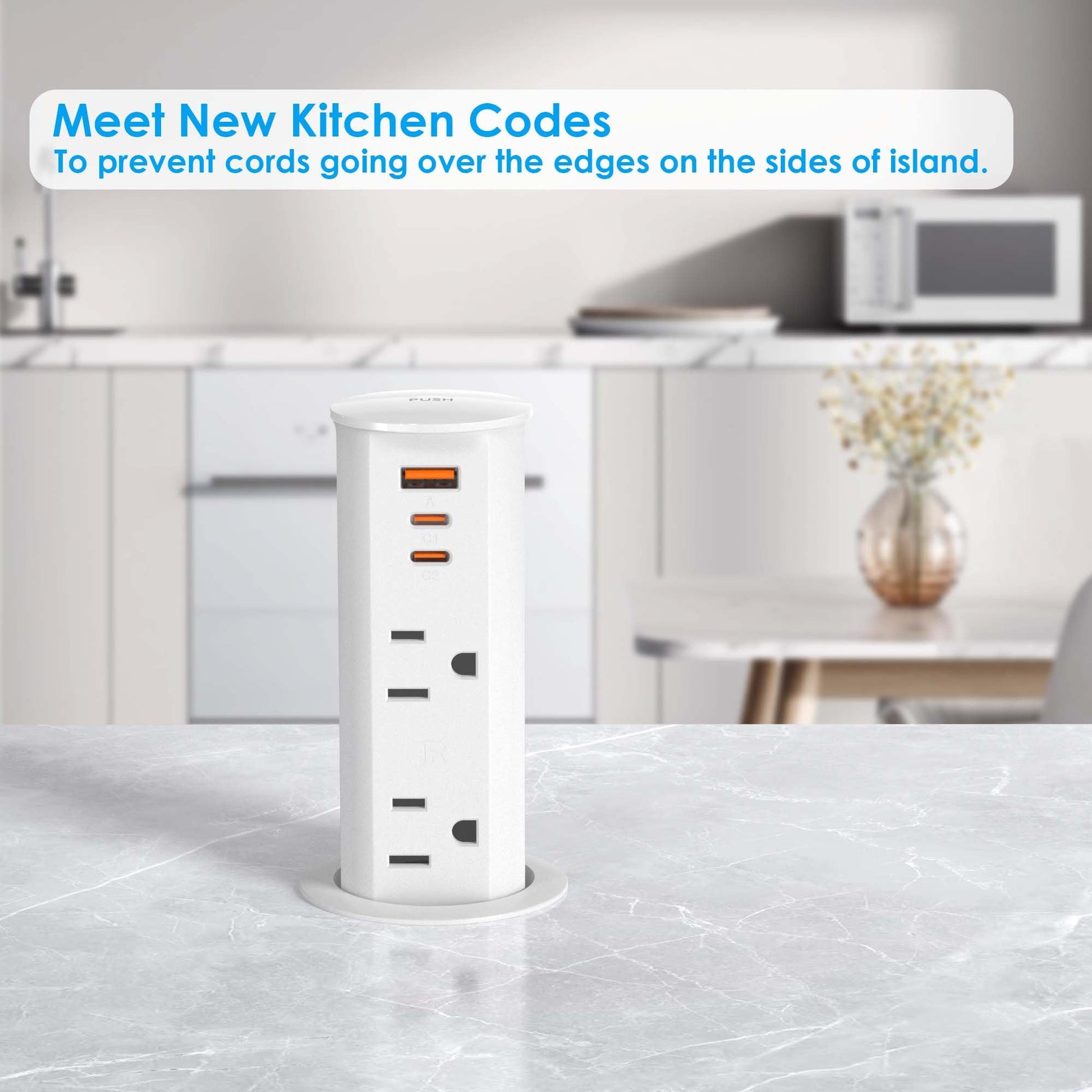 - A gentle press on the top and charge at arm's reach from your desk. No more climbing under desk, weaving power cords through hole for power. The pop up countertop outlet features 2 12 amp rated receptacle for powering appliances and 20W power delivery USB ports for fast and stable charging your phones. Provides multiple options when you need more than one plug at a time.