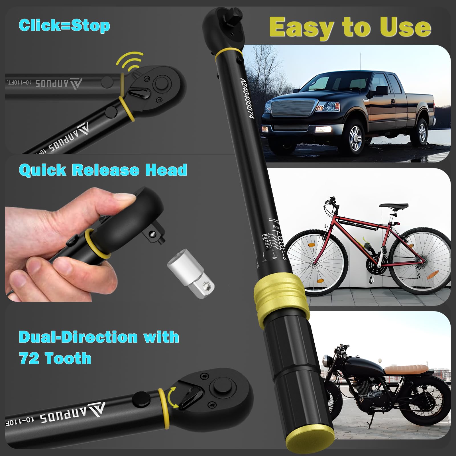 ANPUDS 1/4 3/8 1/2-inch Drive Torque Wrench, 5 Pcs Click Torque Wrench Set, 20-240in.lb, 10-110Ft.lb, 30-250Ft.lb with 2 Adapters, Dual-Direction, 72-Tooth, Dual Range Scales for Bike, Motorcycle, Car