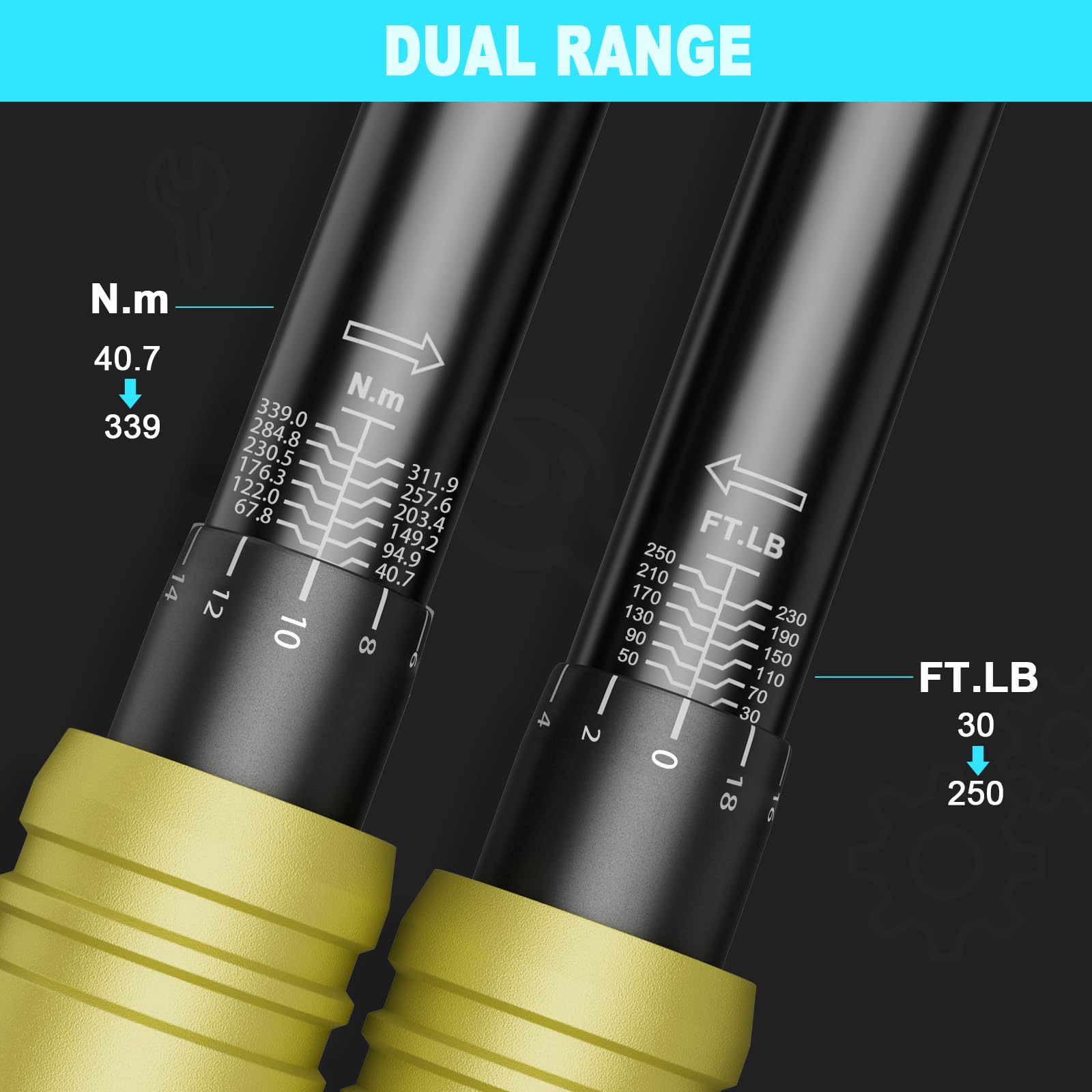 - 【Durable & Comfortable】The 1/4 3/8 1/2-inch torque wrench is made of wear-resistant and rust-resistant chrome vanadium steel with high contrast and easy to read dual scale. The handle is pleasantly grasp, non-slip, rust-free and corrosion-resistant. Excellent material extends the life of torque wrench.