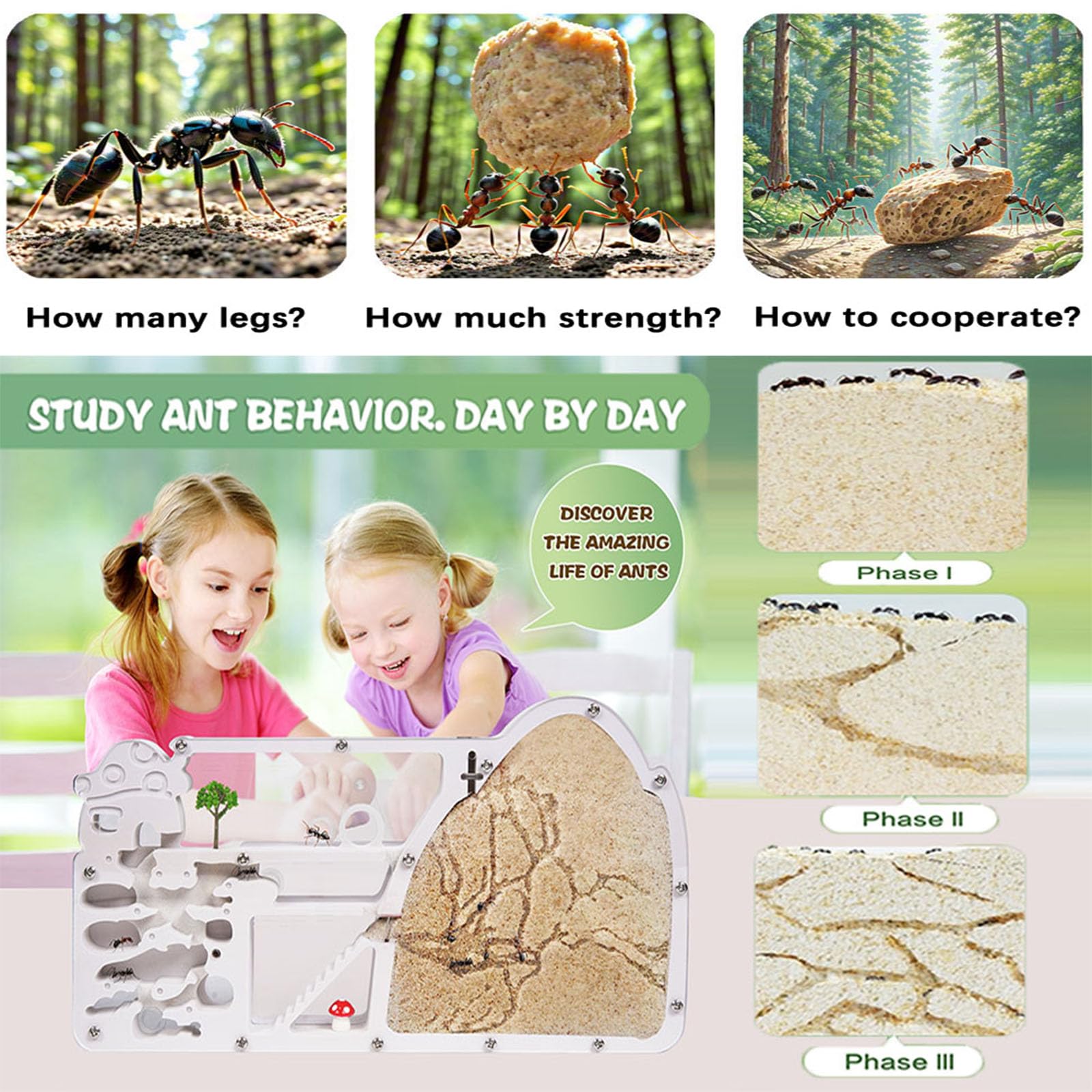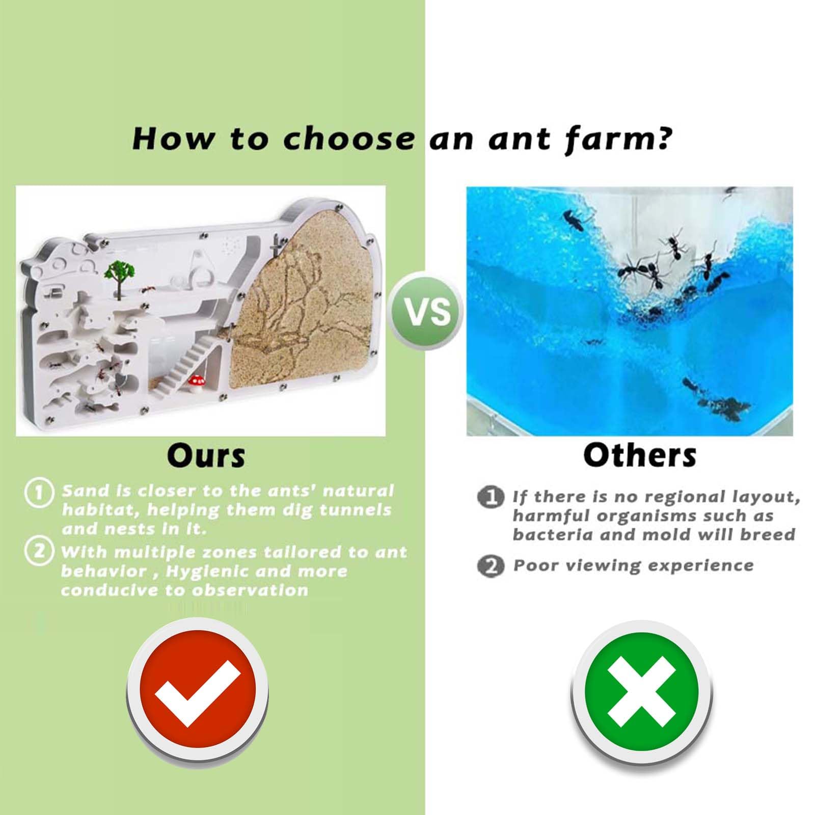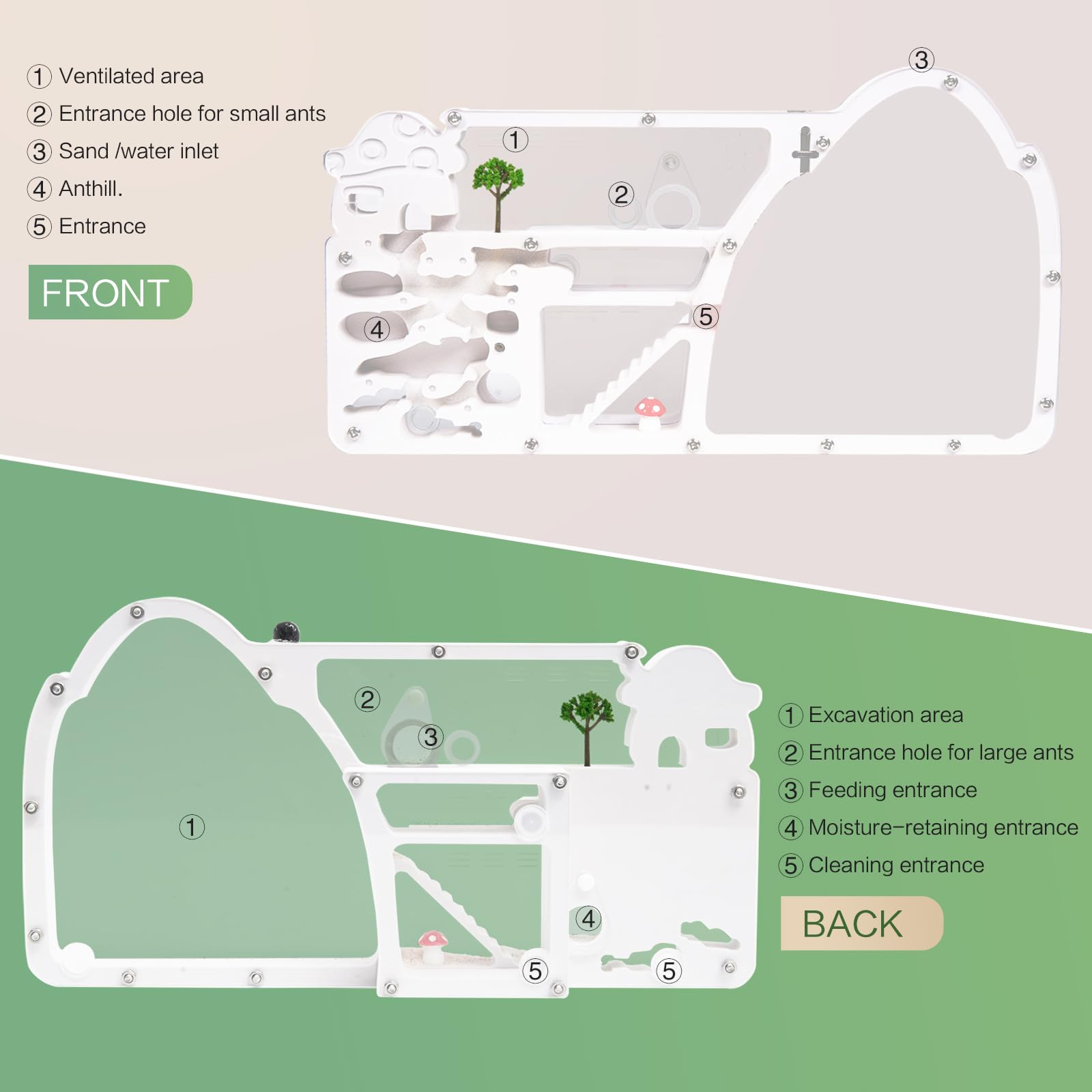 - 【Super big ant farm】With multiple zones tailored to ant behavior, you'll find it easier to care for and observe your ants. These include a digging area, feeding zone, watering station, and egg-laying chamber.All the areas that your ants need!