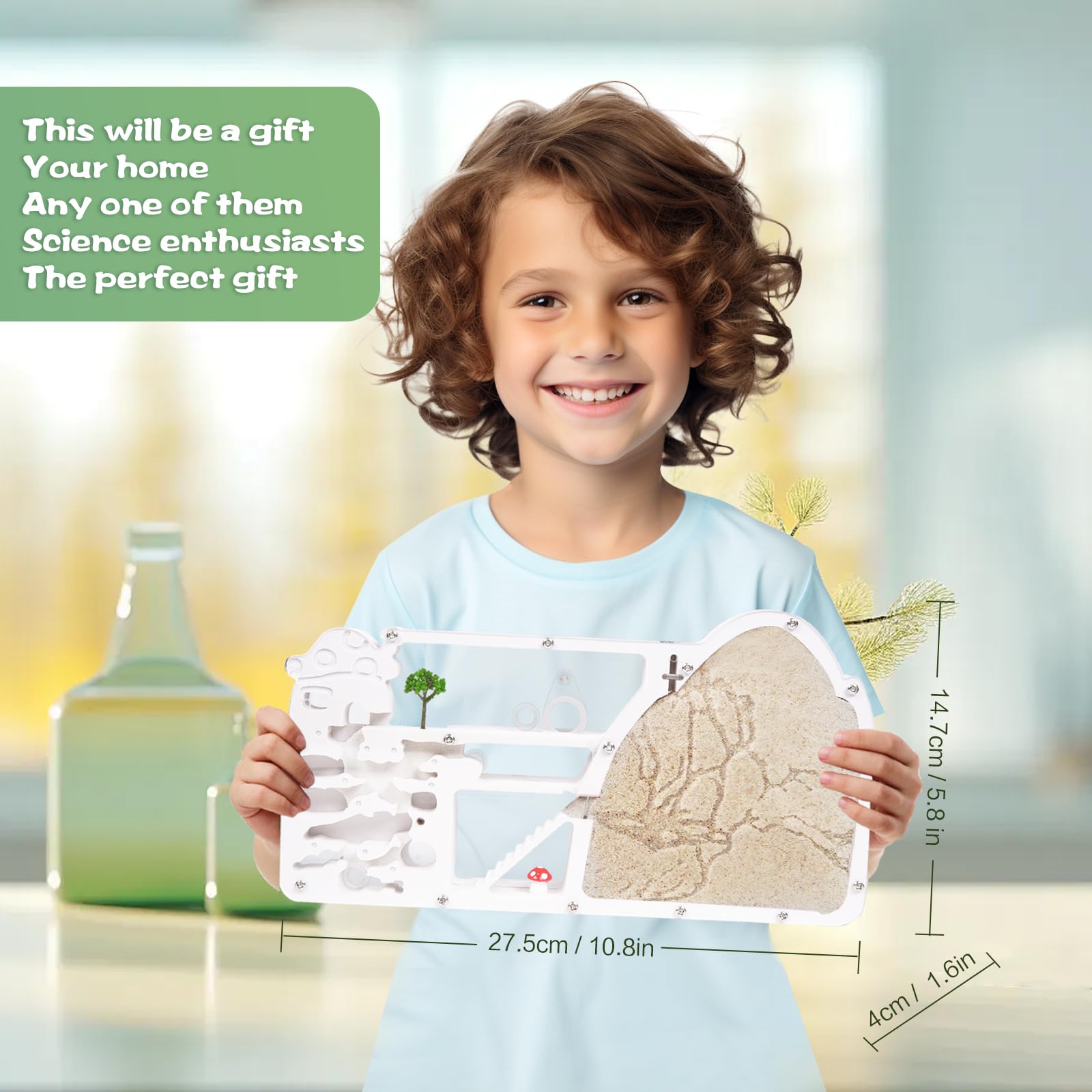 - 【Education And Fun】Teach your children about the wonders of nature and the intricate workings of an ant colony. Our double-sided ant farm design offers a comprehensive view of ant activity, from digging and eating to sleeping and interacting with one another. Our ant farm is perfect for all sizes of ants and measures 10.8in x 5.8in x 1.6in.