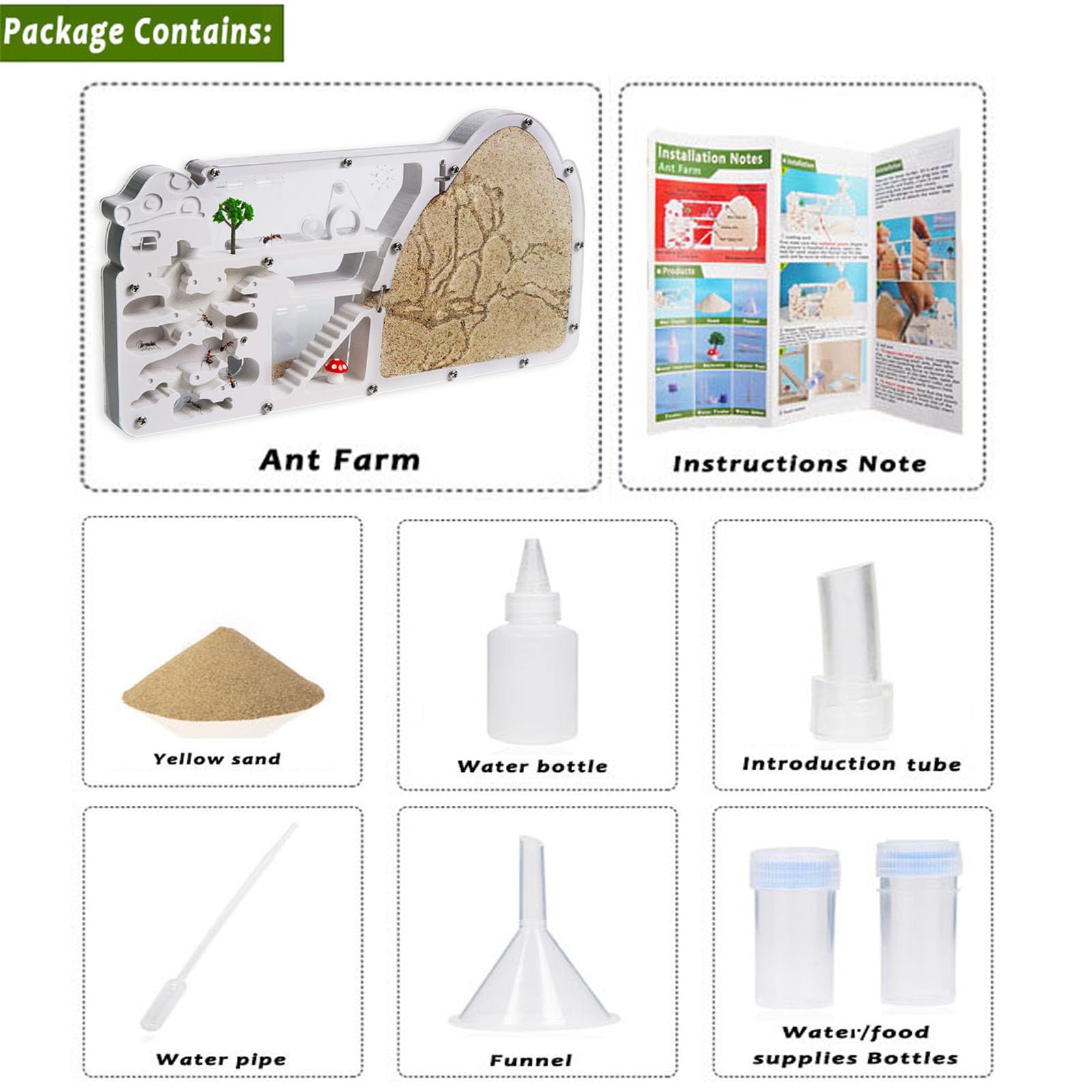 - 【Ant Farm Kit / Ants are not included !】Each package includes 1 ant farm castle, 1 pack of dedicated sand, 1drip bottle, 1 funnel, 1 water tower,1 dropper, 1 instruction manual, etc. ATTENTION: LIVE ANTS ARE NOT INCLUDED !