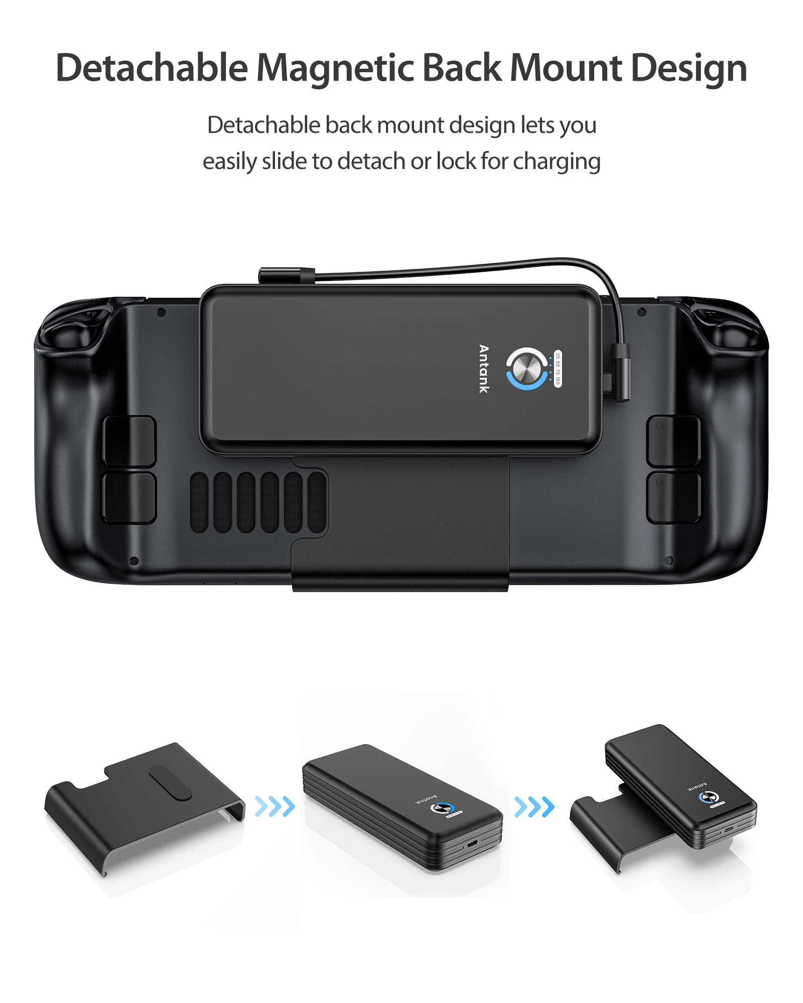 - Magnetic Detechable Back Mount Design: Built-in high-quality magnets to lets you easy slide to detach or lock for charging. This power bank will not fall even shake your Steam Deck vigorously. Forget about the mess-up cable, and never need to hold the power bank any more. Note: This battery is magnetically attached and charged with a USB-C Cable, and is not compatible with protective case.