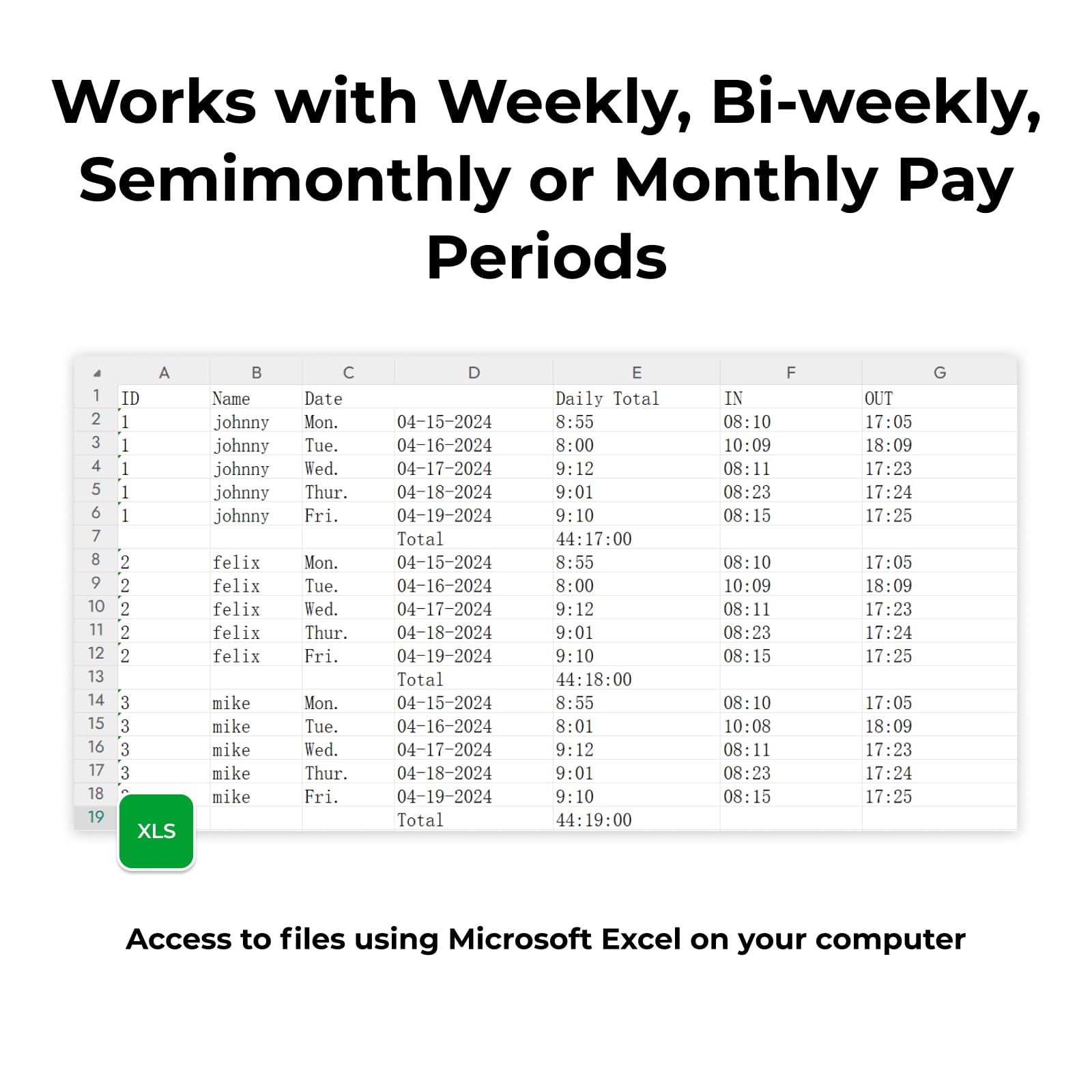 - ENSURES ACCURATE PAYROLL: Automatically detects employee attendance. Seamlessly move data from the time clock to your computer using a USB flash drive, view files with Microsoft Excel on your computer, and accommodate weekly, bi-weekly, semi-monthly, or monthly payroll cycles to suit your business requirements