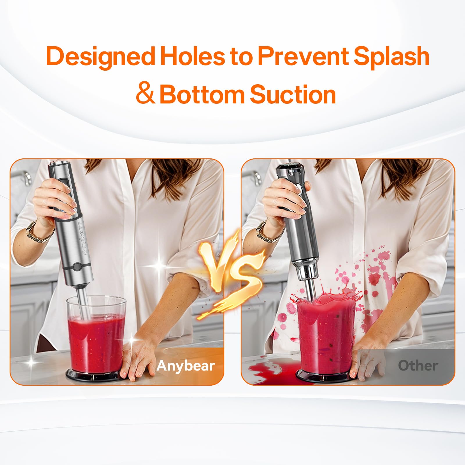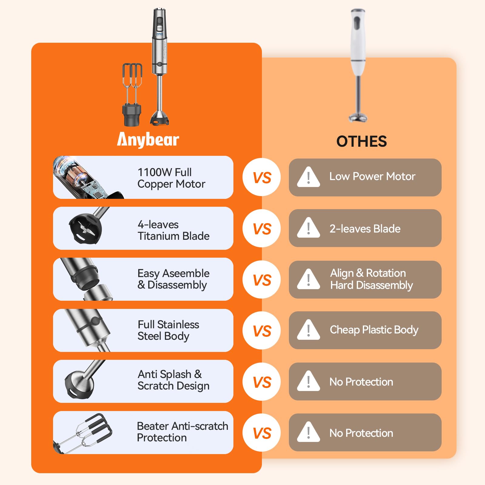 - 【1100W Powerful Motor & Full Stainless Steel Body】Anybear immersion hand blender is equipped with 1100W super powerful full copper motor which ensures stronger motivation with 3X longer working life. It is quiet and efficient, allowing you to perform multiple stirring tasks easily and quickly. The body of the handheld blender is made of stainless steel, it is heavy duty but you won't feel tired to hold the stick to finish blending recipes.