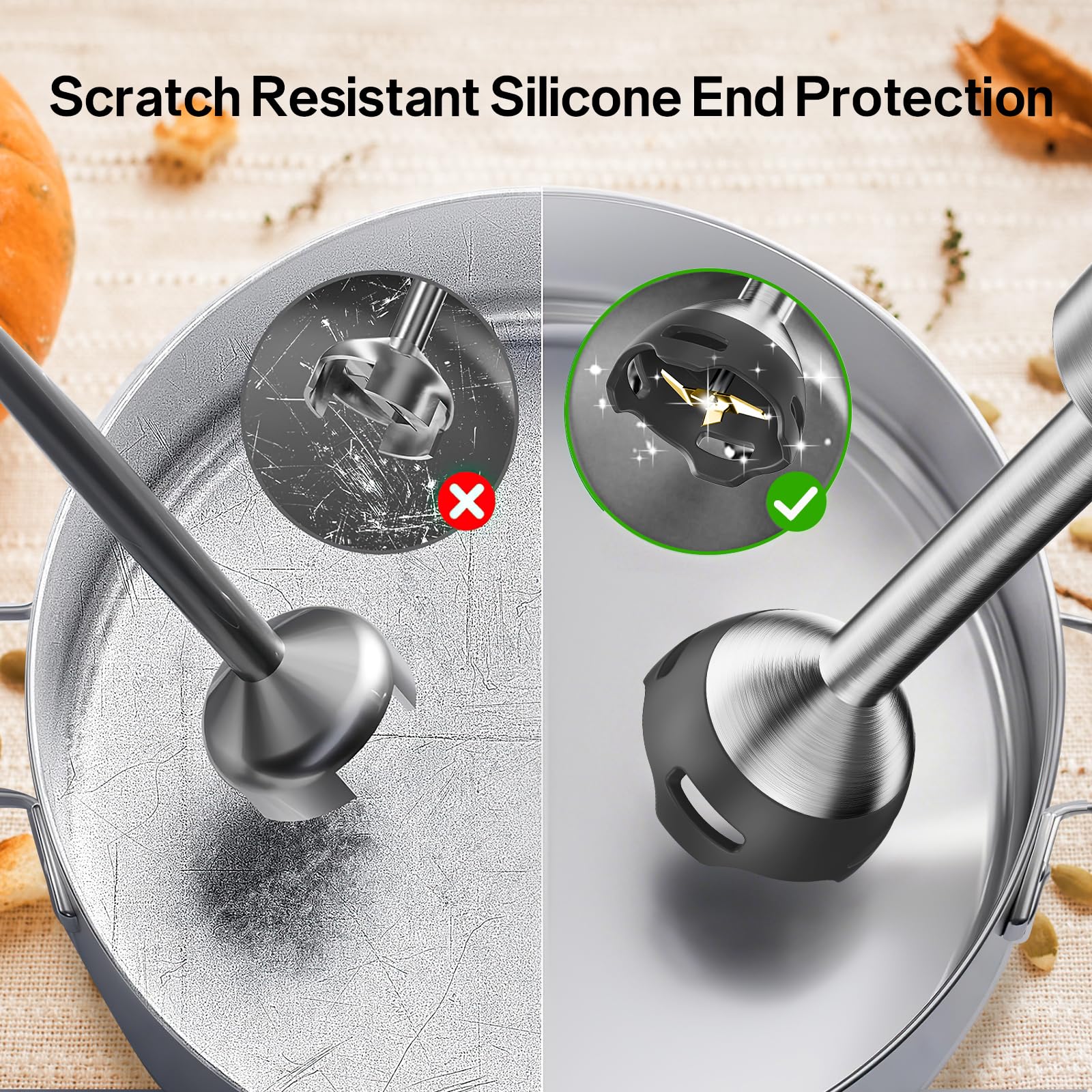 - 【Prevent Splash & Bottom Suction End】The stick blender is designed with titanium-plated blade that helps you stir hard foods easily. The sharp blade is made of food-grade material, so you can enjoy delicious food safely and securely. It features an unique bell-shaped guard with specially designed holes that protects your pans and food containers from scratches while preventing food splatters, keeping your kitchen spotless. What's more, the design can avoid pot suction while blending, so you wont' feel operation is annoying.