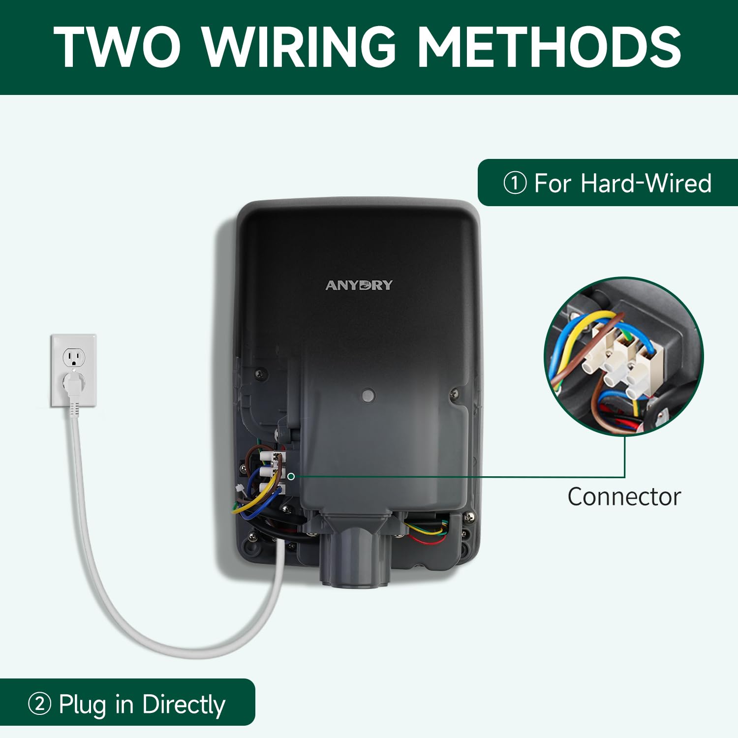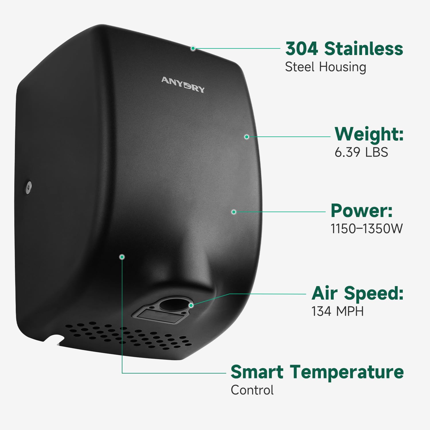 anydry Compact Hand Dryer, High-Speed 1350W Airflow, Matte Black Finish, Space-Saving for Commercial & Home Use, Model 2803Y