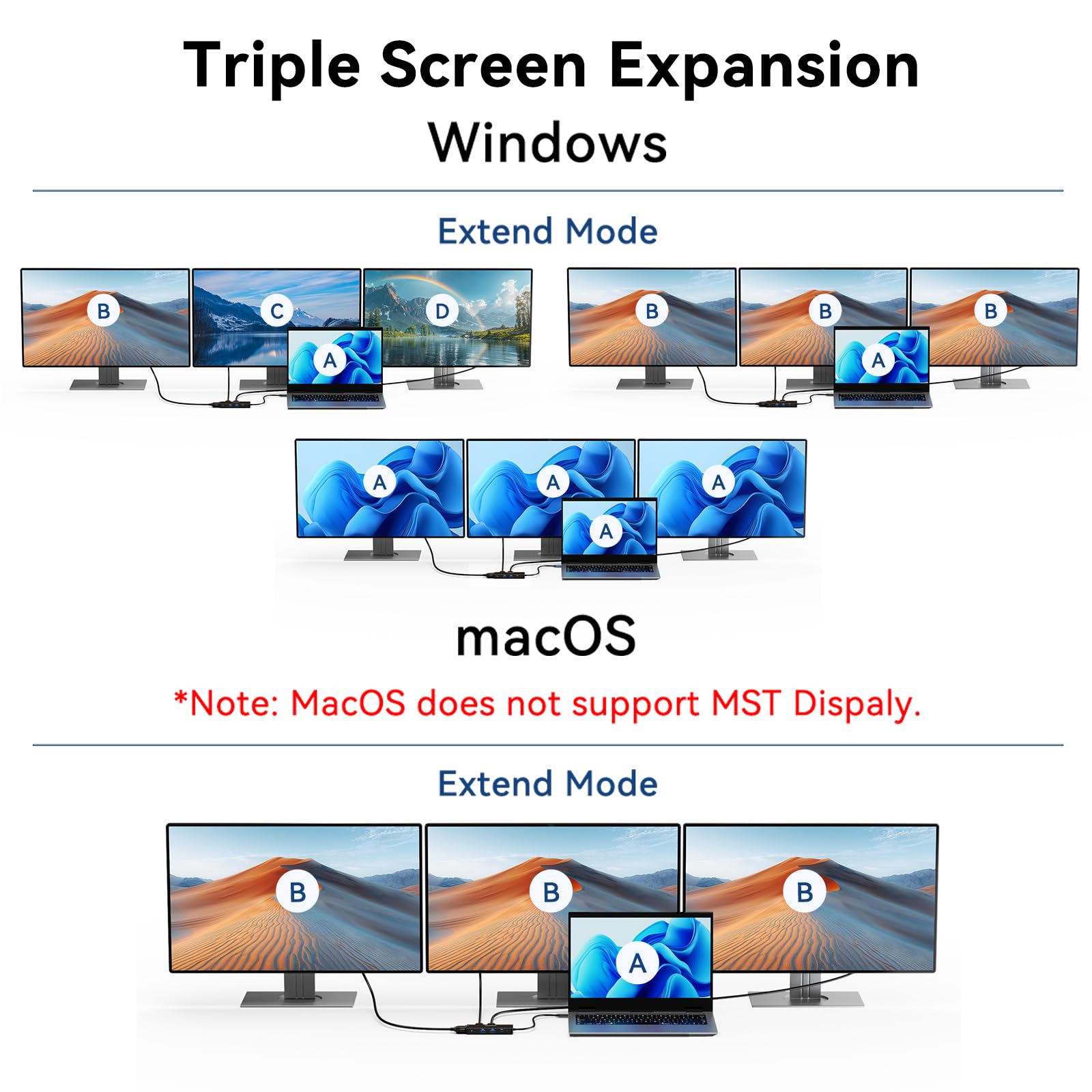 - Triple Display Support: Expand your workspace effortlessly with the USB-C Docking Station, With dual HDMI and VGA port , you can connect up to three monitors simultaneously. This feature is perfect for multitasking, enhancing productivity by providing ample screen real estate for your applications, presentations, and projects. (Note: macOS only supports Mirror mode, displaying the same content across all external monitors.)