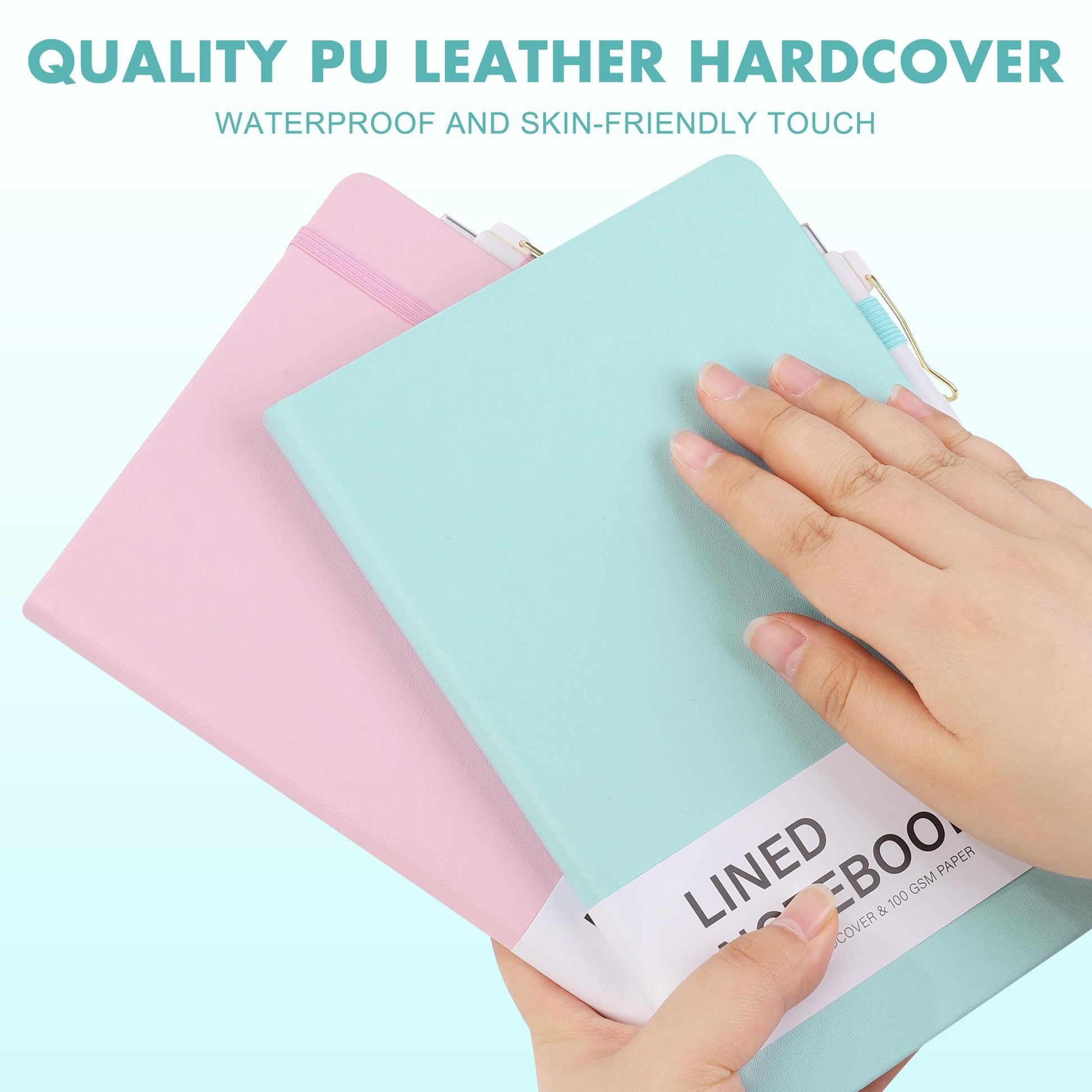 - Quality leather & paper: our A5 notebooks are made of 100 gsm thick paper, providing a smooth touch and resisting ghosting and bleeding, compatible with most pens, pencils and markers; the lined journal notebook with pens feature premium PU leather hardcover, waterproof and easy to clean, helping the notebooks stay upright without the pages curling or bending; the ballpoint pen is designed with a 0.5 mm bold tip for smooth, non-leaking drawing, ideal for use with the journal