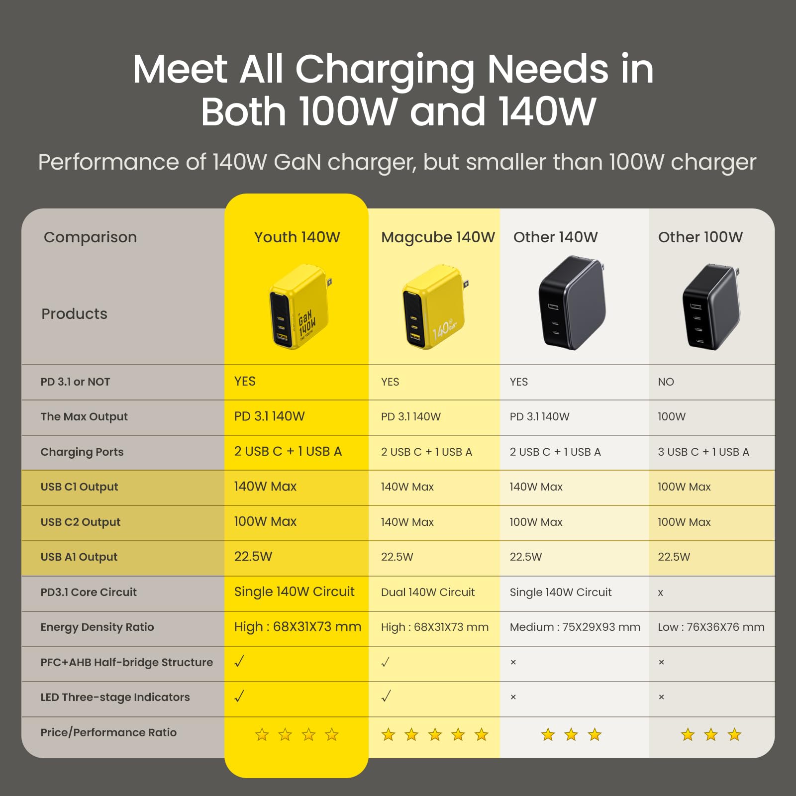 - Revolutionary GaN technology combined with a foldable plug reduce the AOHI Youth 140W size by 30% compared to original 140W chargers, and it's also 5% smaller than other 100W usb c chargers in size; Meaning a more portable charger in your palm without sacrifices in power. At around 11 ounces, this charger uses a reinforced structure and premium chips. It's slightly heavier than most 100W chargers but comparable to 140W chargers. Meanwhile, this 140W charger is easily compatible with almost all 100W devices. While meeting all your charging needs, this PD 3.1 140W charger will bring you more possible charging experience about PD 3.1 in the future