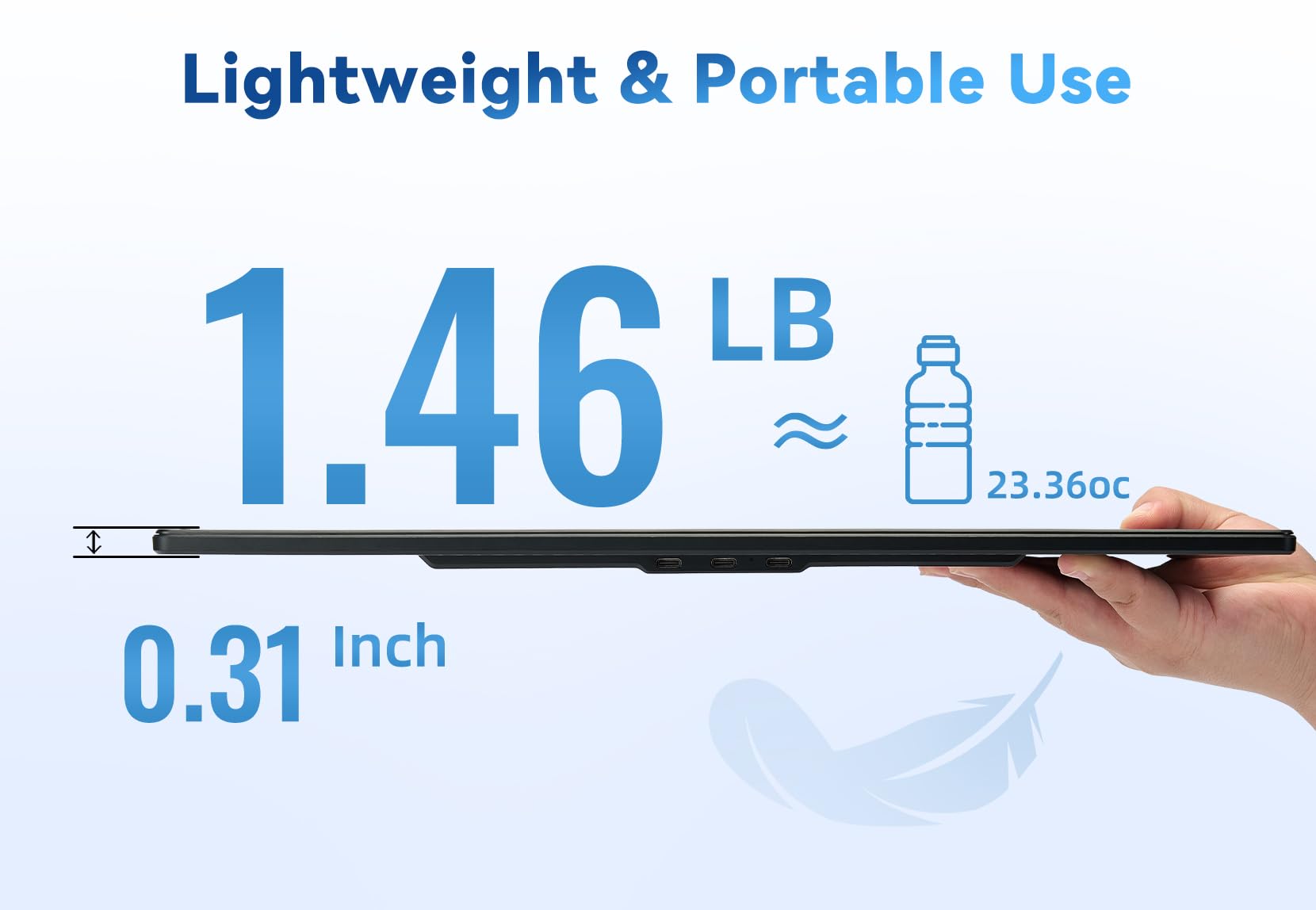 - 【1.46LB Ultra Light for Travelers】At just 1.46lb, this display is as light as a 23.36oc water bottle. It's only 0.3 inches thick. This makes it incredibly easy to carry. If you need to travel or take business trips, this display is a must - have. It won't add any extra weight to your luggage, and its thin profile means it won't take up much space. Whether you're going on a short trip or a long-distance journey, you can enjoy the benefits of a large screen without the inconvenience of a heavy, bulky device.