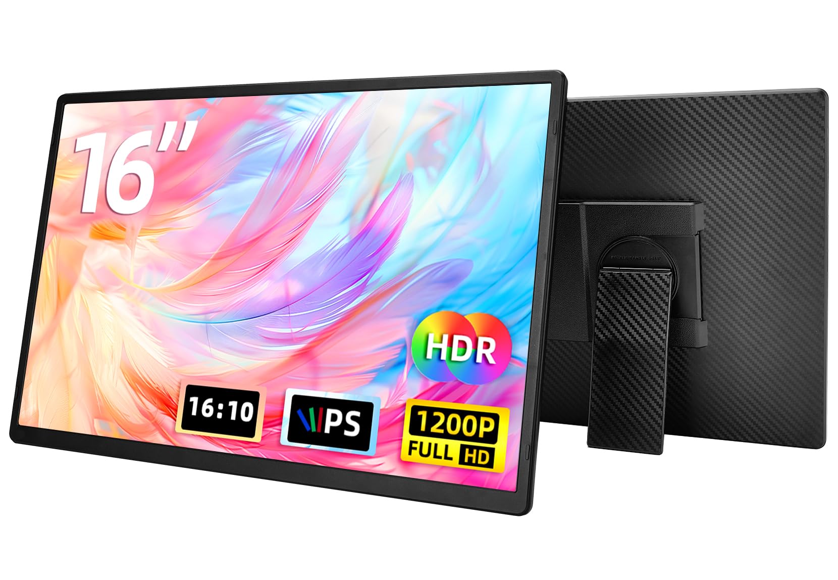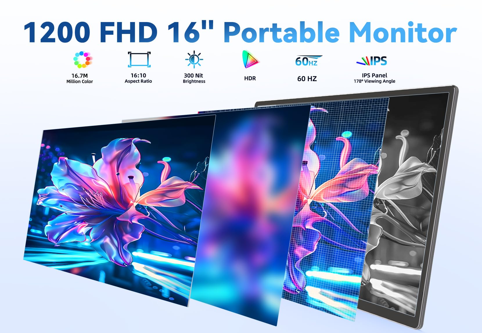 - 【16 inch 1200P Full HD】This portable monitor features a 16" large IPS screen. The screen boasts a resolution of 1920*1200, with a brightness of 300 nits, and supports a 178°wide viewing angle, delivering accurate and bright colors, and astonishing viewing.The monitor supports HDR mode and features an anti-glare matte screen with low blue light eye protection, making it flicker-free and more comfortable.